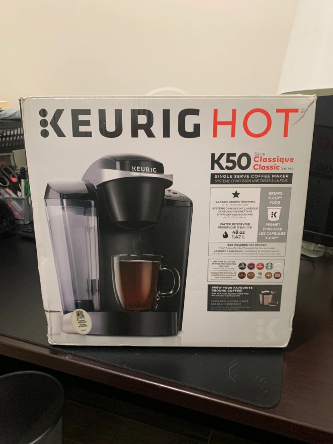 Never used before. This Keurig K50 Classic Series coffee maker brews K-Cup pods or ground coffee. It features a 48oz water reservoir and brews multiple cup sizes. The box includes the K50 brewer.