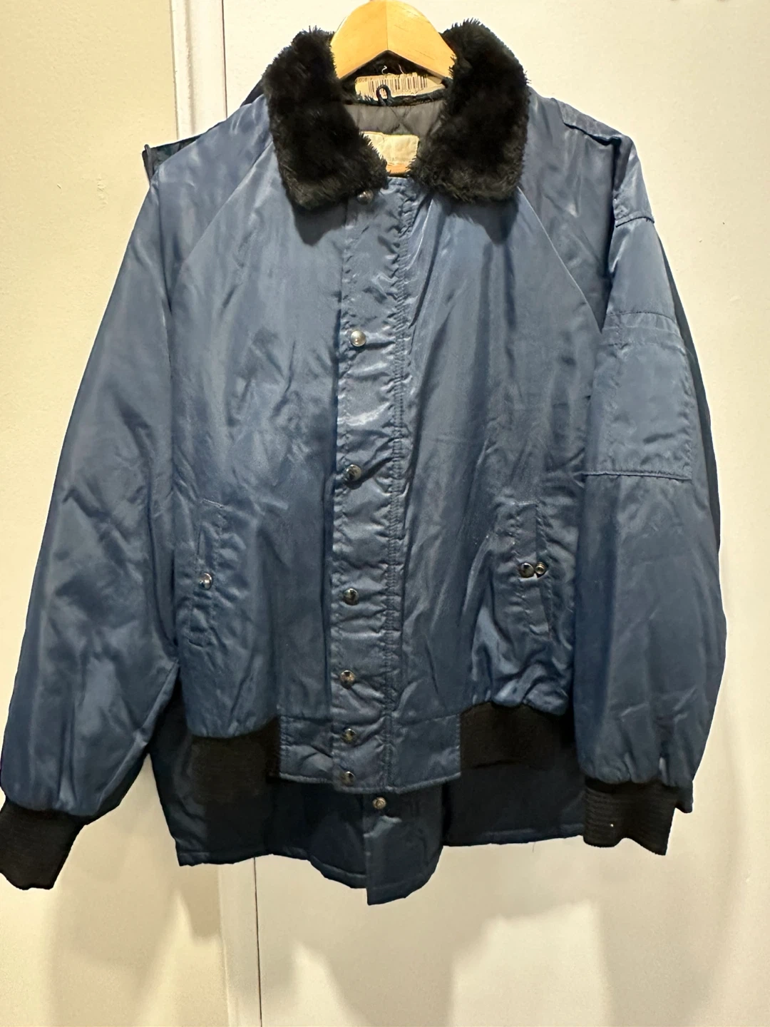 This is a blue bomber jacket featuring a removable faux fur collar. It has ribbed cuffs and hem for a snug fit. It's great for staying warm during cooler weather!