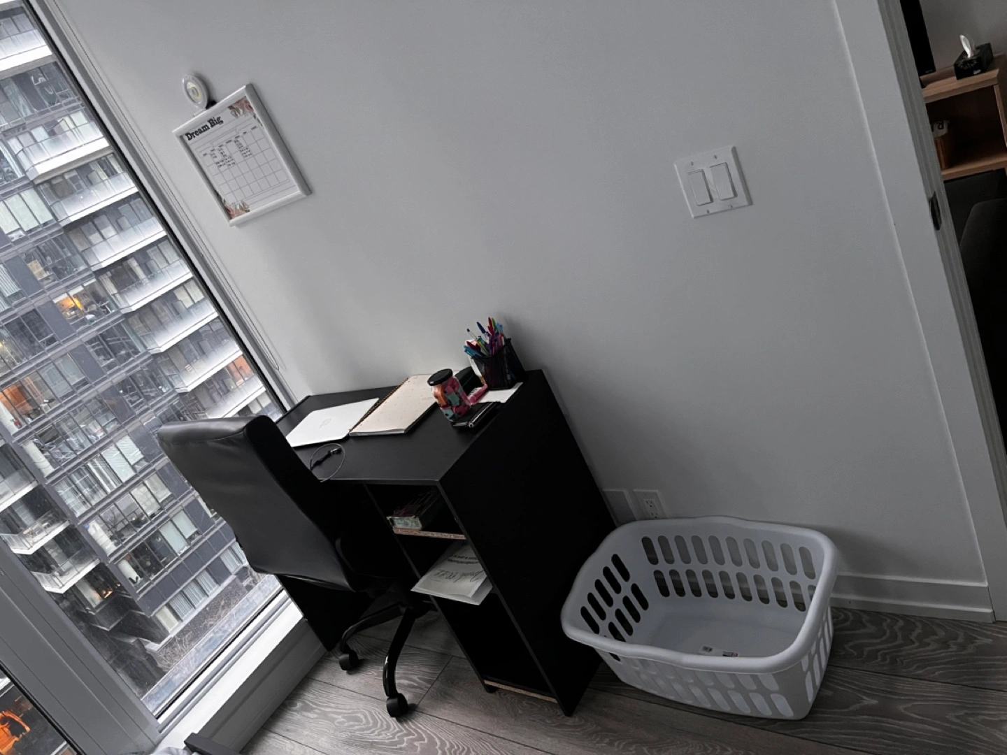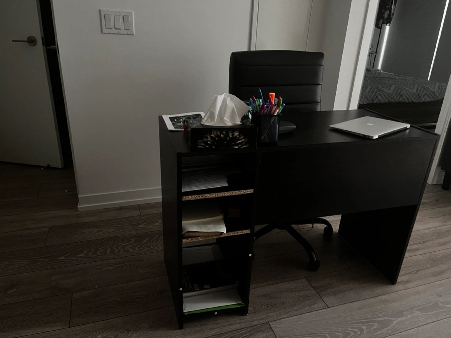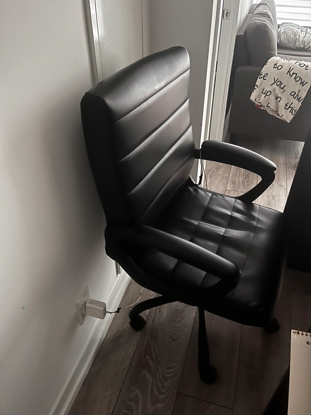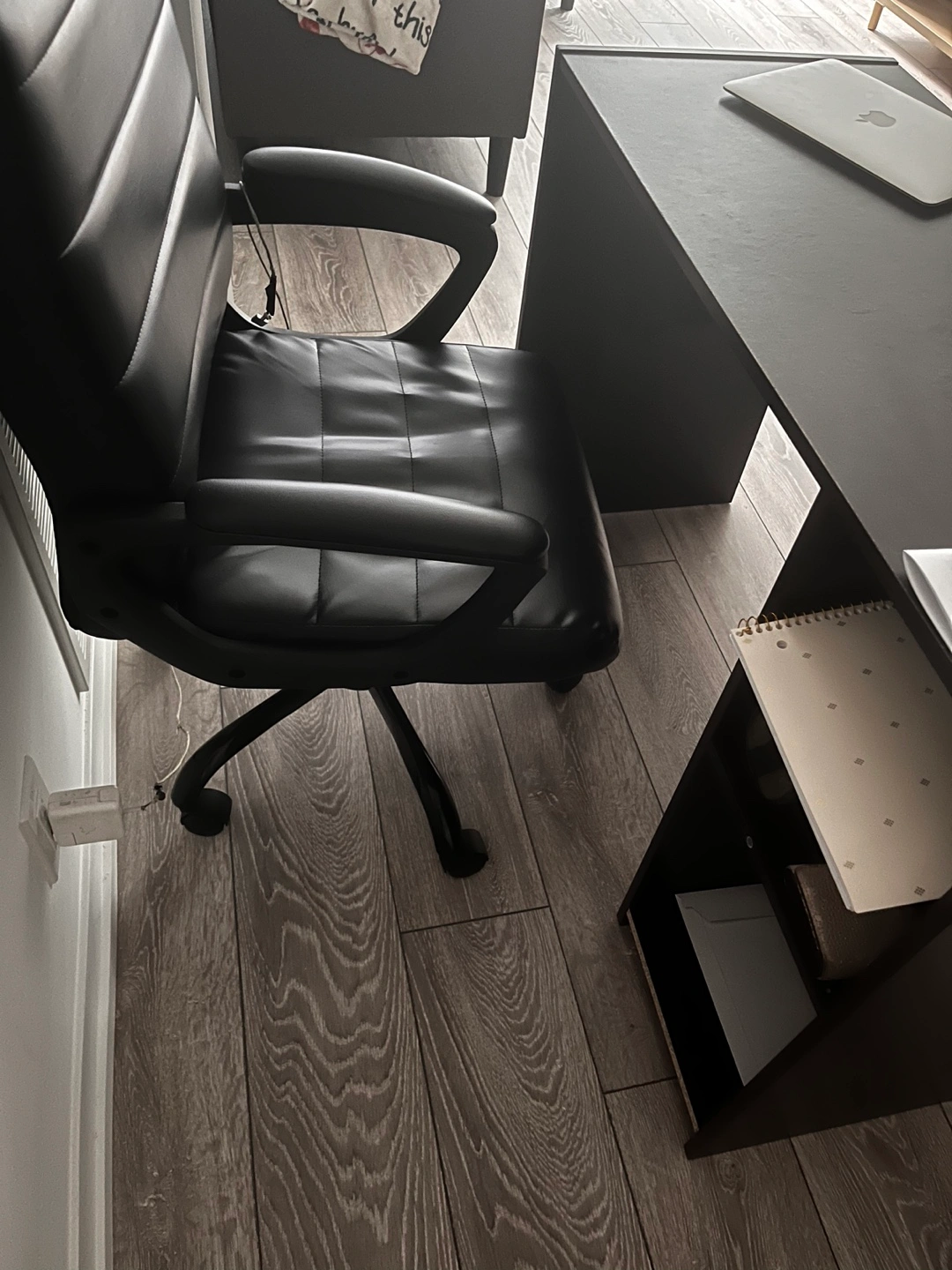 Black office chair with adjustable height and swivel base, black wood like table. Okay condition. I’ve used it for 7 months. Both for the price you see