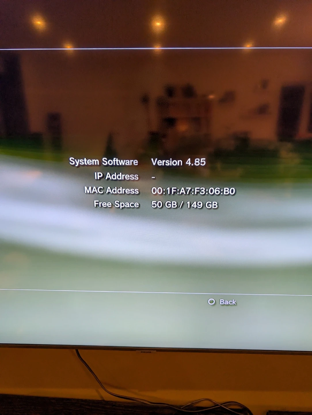 This is a black Sony PlayStation 3 console, model CECH-P01. It's manufactured in December 2008. The system software is version 4.85, and it has 149 GB of storage with 50 GB free. This console is great for gaming and media playback!