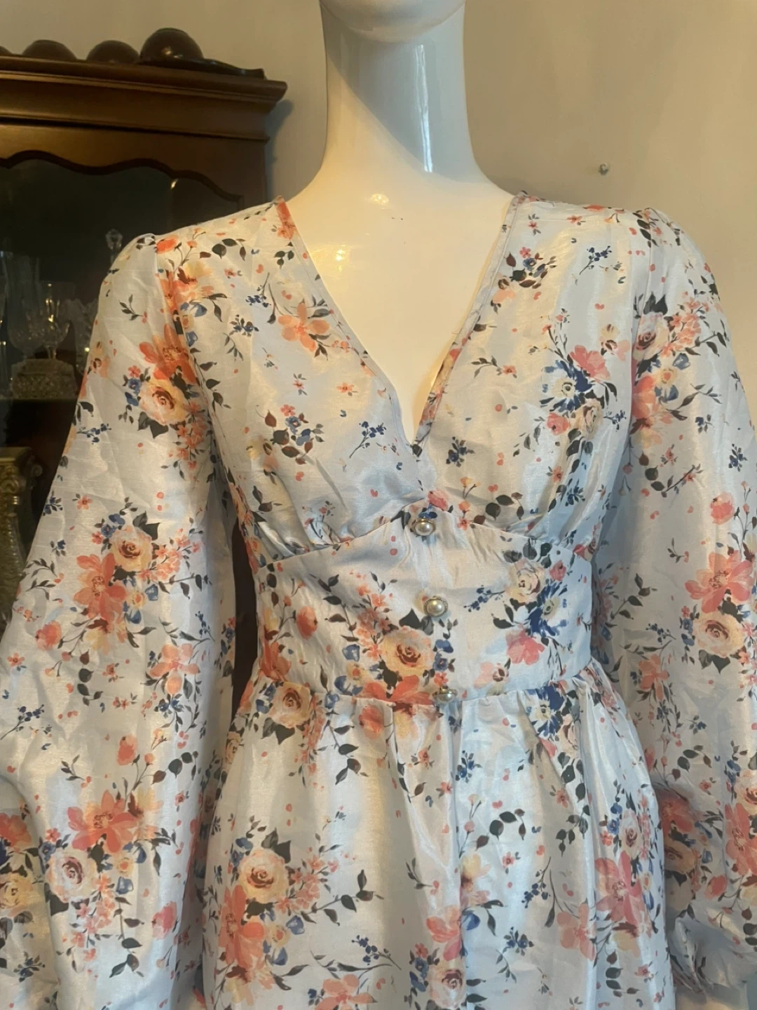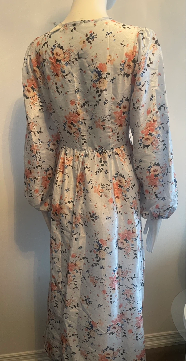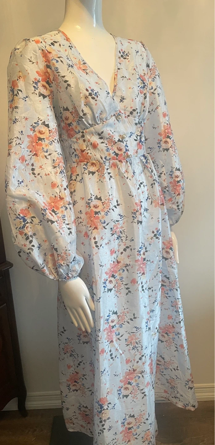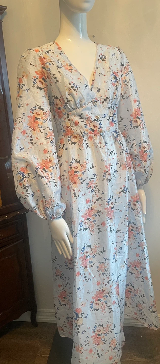 This elegant maxi dress features a delicate floral print on a light blue background. It has a flattering V-neckline, long puffed sleeves, and a cinched waist. The flowy skirt offers a graceful silhouette.