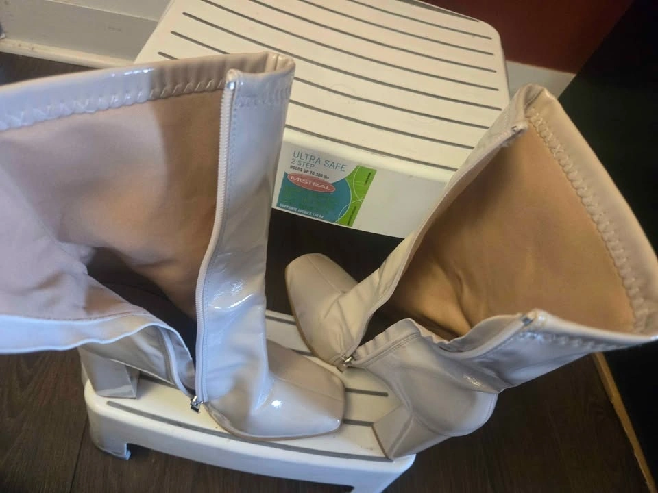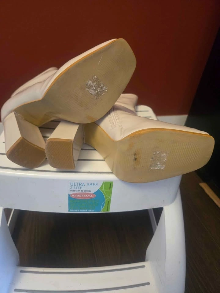 1- Women's cream or beige ankle boots, patent leather with glossy finish, square toe, block heels, zipper closure. Size 8. Used a couple of times.
