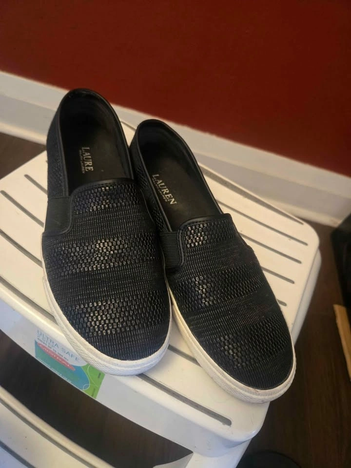 3- Ralph Lauren Jinny slip-on sneakers in black, rubber sole, breathable linings, padded foot-bed. Size 8.5. Very comfortable for all-day wear.