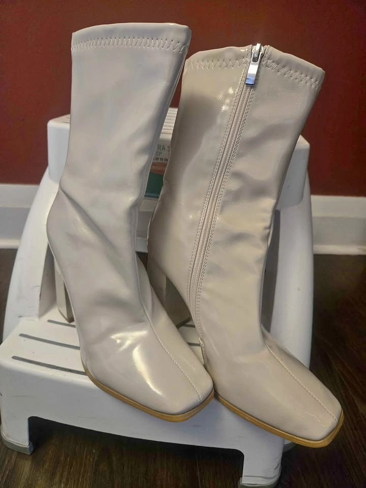 1- Women's cream or beige ankle boots, patent leather with glossy finish, square toe, block heels, zipper closure. Size 8. Used a couple of times.