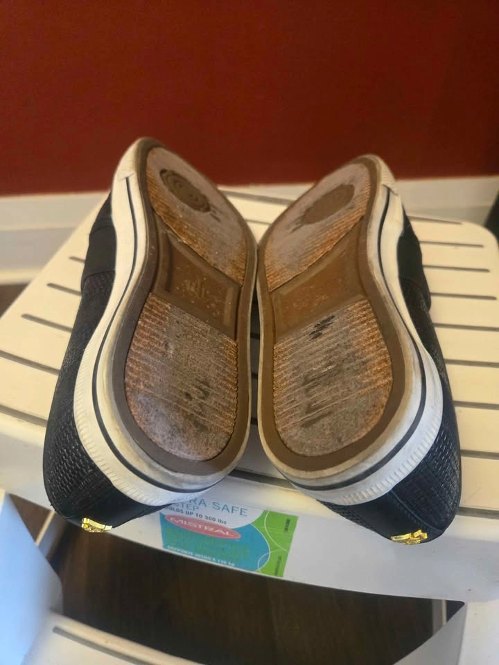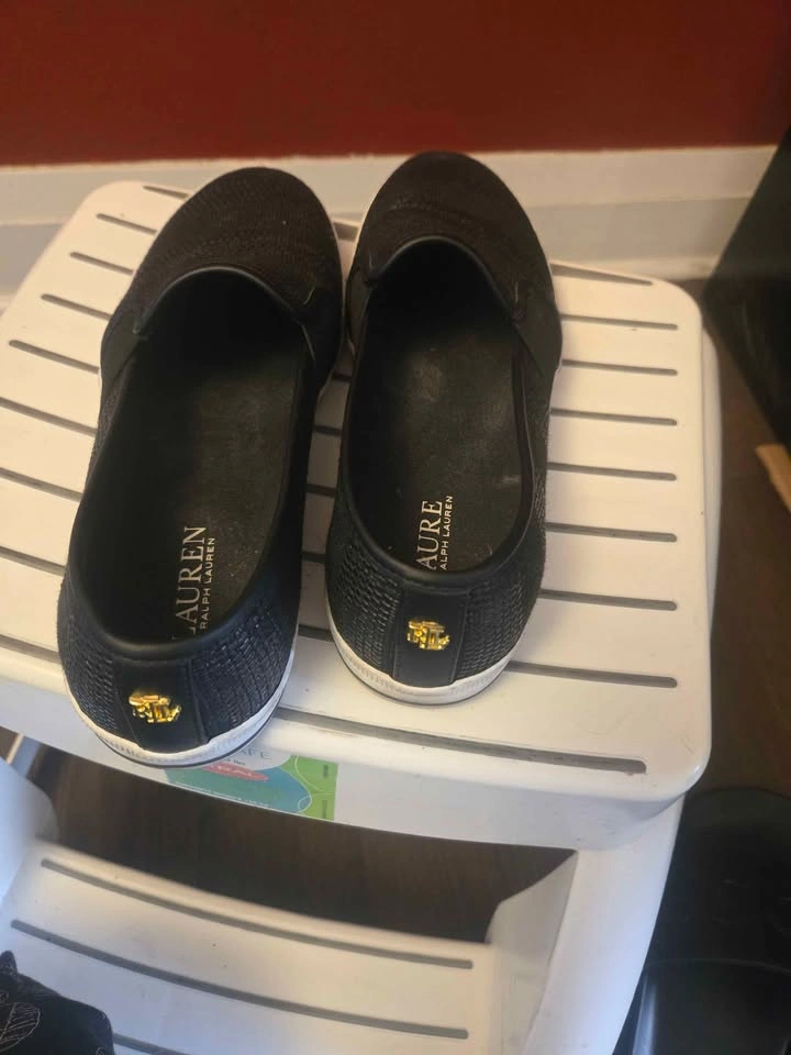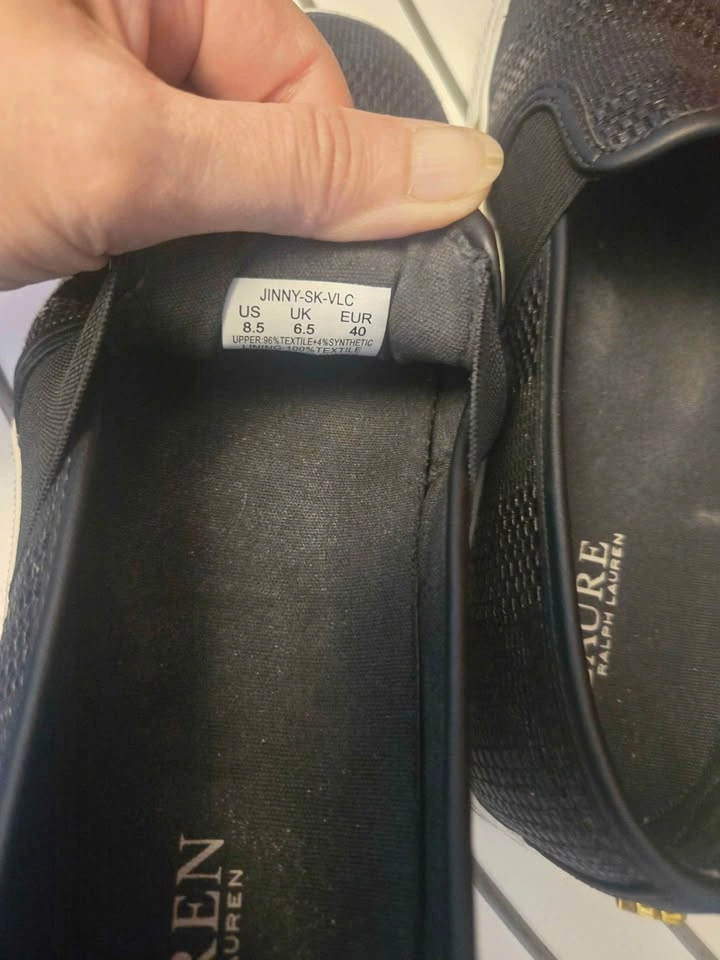 3- Ralph Lauren Jinny slip-on sneakers in black, rubber sole, breathable linings, padded foot-bed. Size 8.5. Very comfortable for all-day wear.