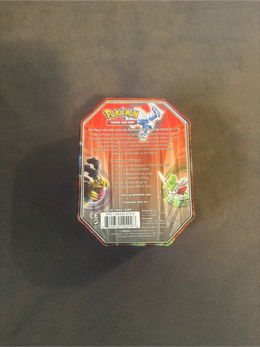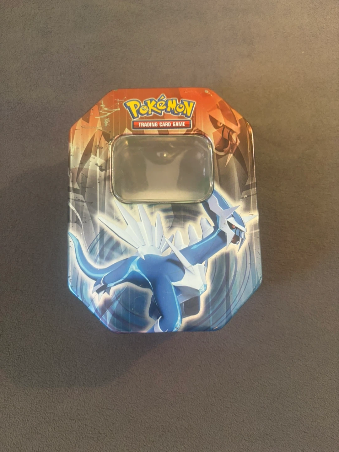 Collectible Pokemon TCG tin with awesome Dialga art on the front. Great for storing your cards or other small stuff. Has original clear plastic insert inside.