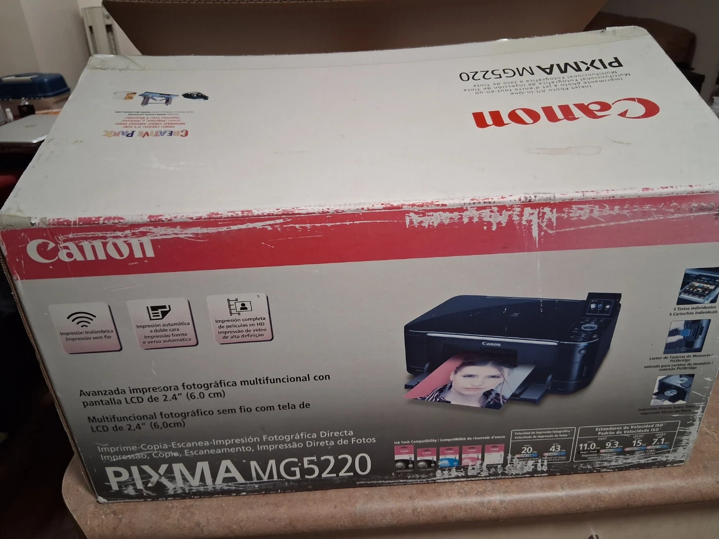 This is a Canon PIXMA MG5220 advanced wireless photo all-in-one printer with a 2.4" (6.0 cm) LCD screen. It's capable of print, copy, and scan functions. The printer includes the original box and packaging.