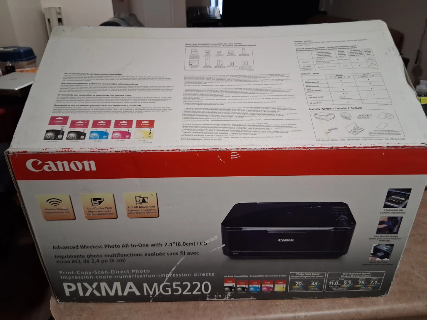 This is a Canon PIXMA MG5220 advanced wireless photo all-in-one printer with a 2.4" (6.0 cm) LCD screen. It's capable of print, copy, and scan functions. The printer includes the original box and packaging.