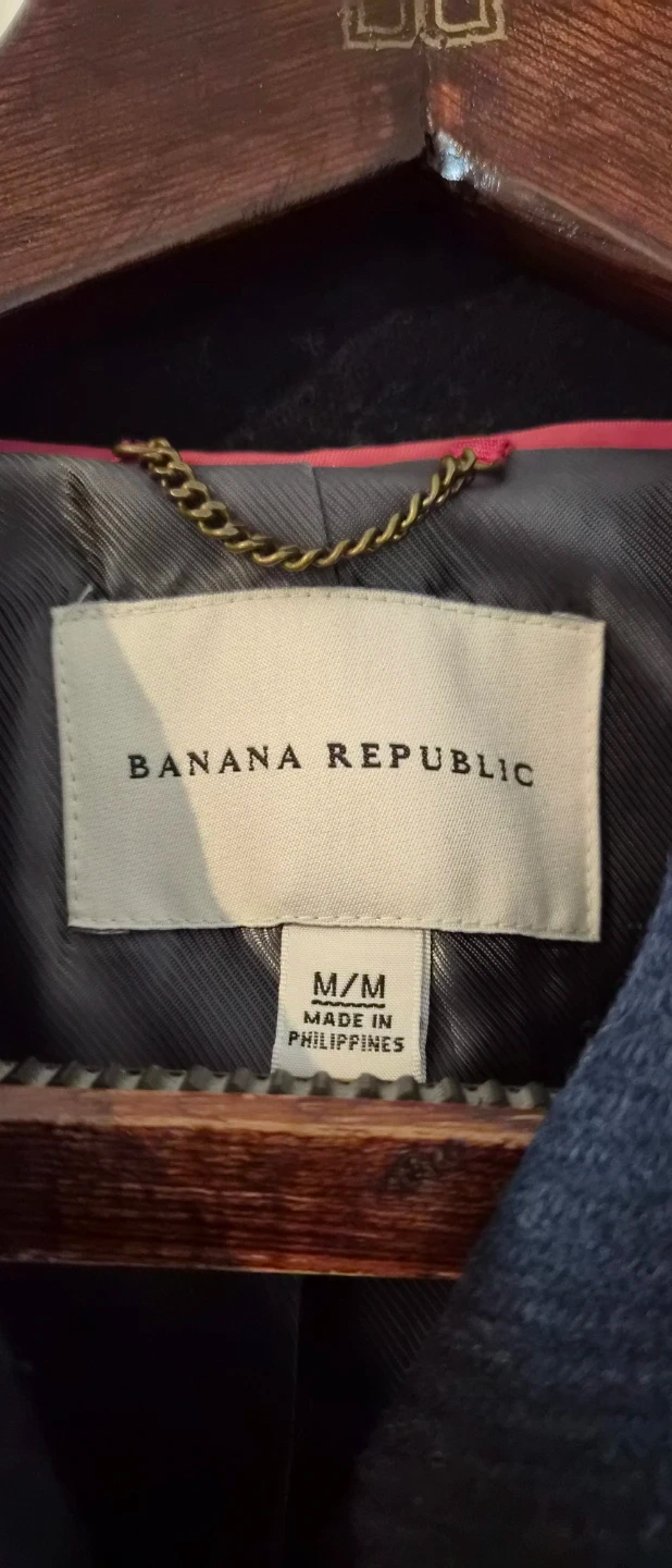 Navy double-breasted peacoat from Banana Republic. Size Medium. Shell is 42% wool, 36% rayon, 22% polyester. Sleeve lining is 100% polyester. Made in Philippines.