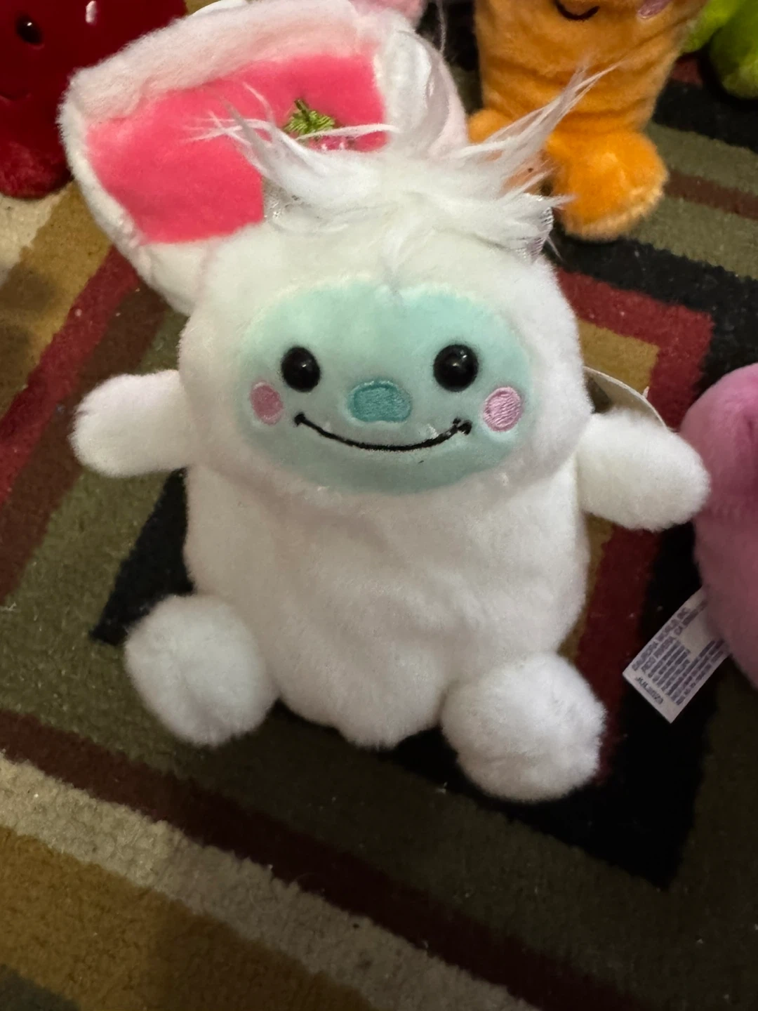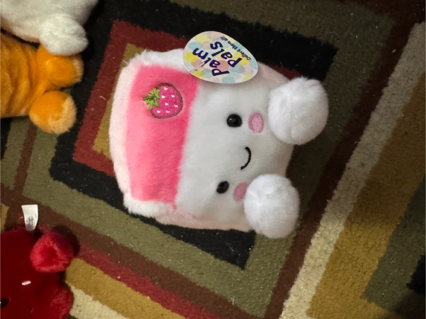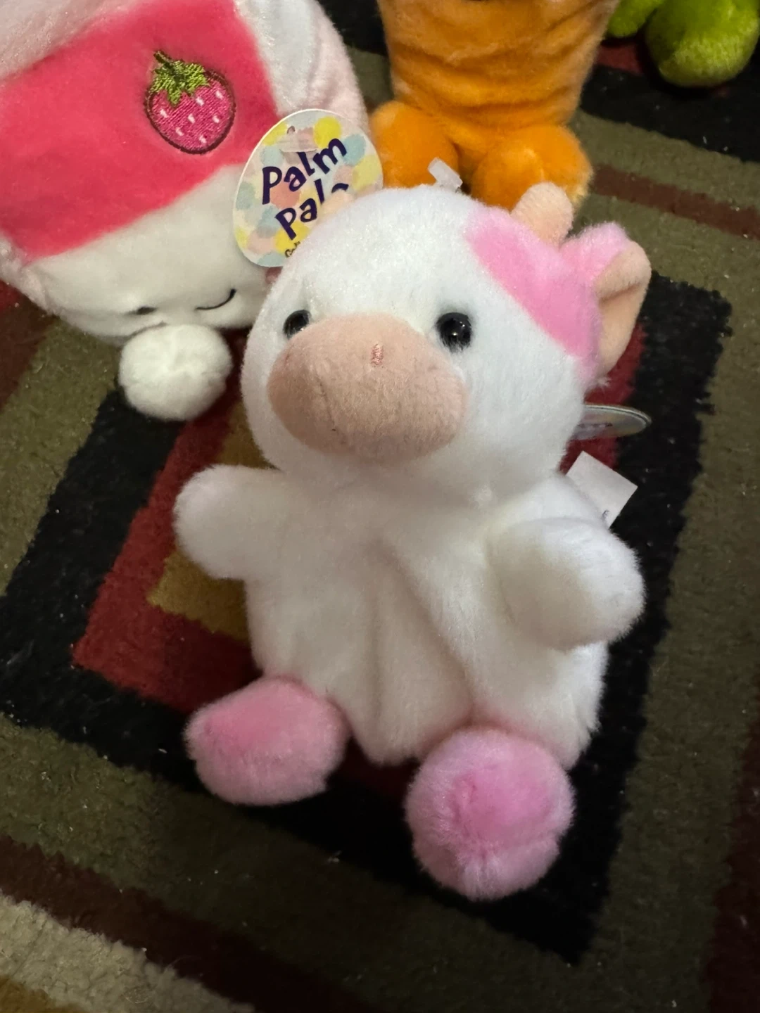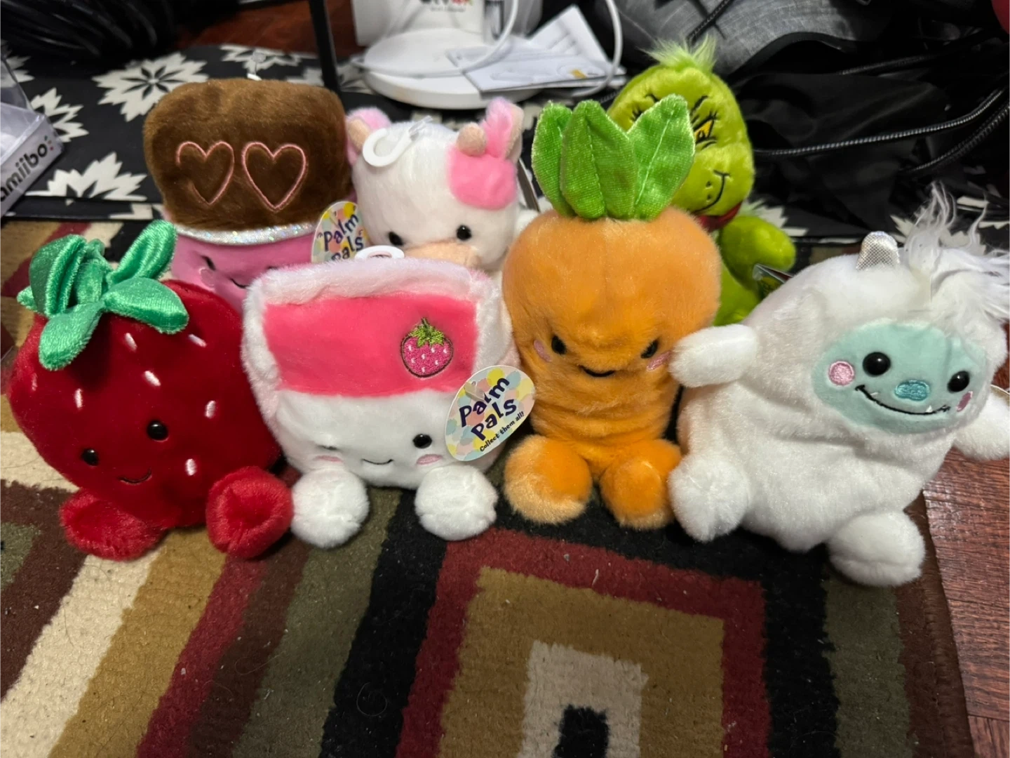 Collect these adorable Palm Pals plushies. This set includes a strawberry, a slice of cake, a chocolate bar, a cow, a carrot, and a Yeti. They're super soft and huggable!
