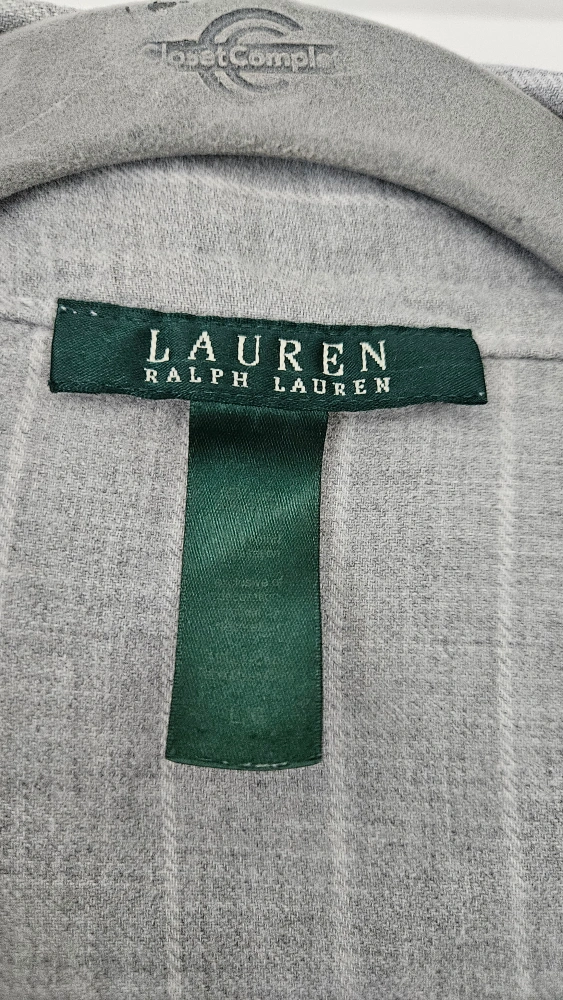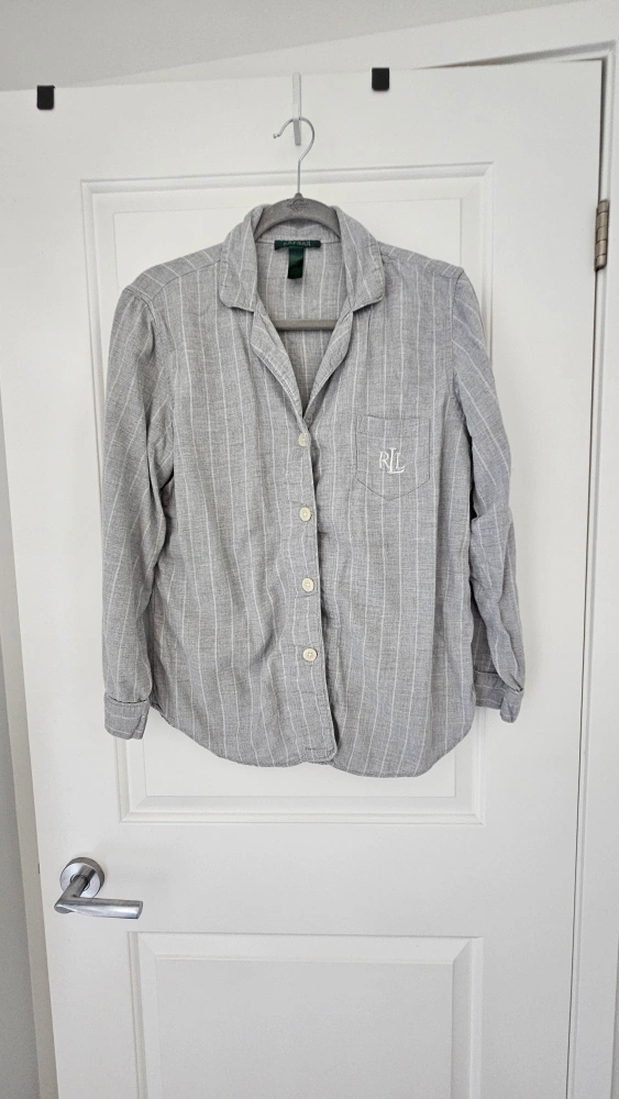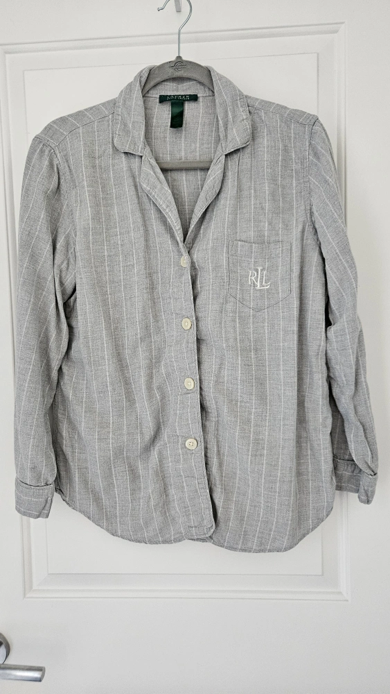 Cozy Ralph Lauren pajama set in a soft grey and white striped pattern! Size Large. The set includes a button-up top with the RL logo embroidered on the pocket and comfortable drawstring pants. Perfect for relaxing evenings and lazy weekends! Incredibly soft material! Perfect for both summer and winter.