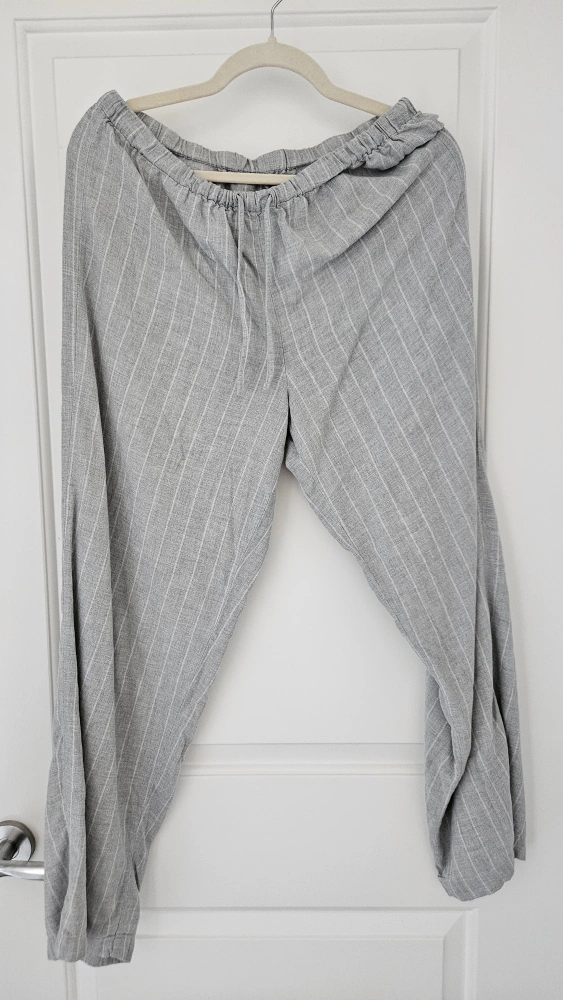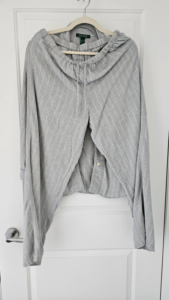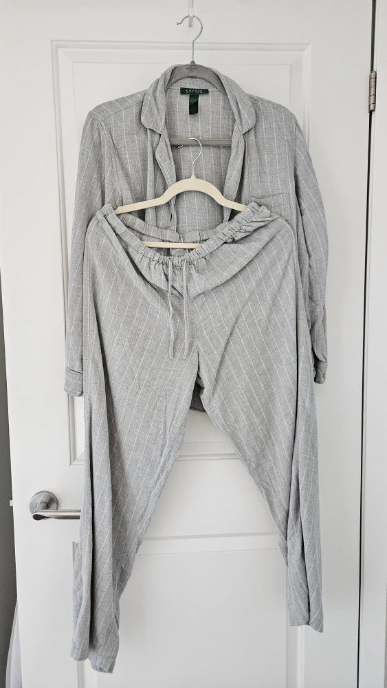 Cozy Ralph Lauren pajama set in a soft grey and white striped pattern! Size Large. The set includes a button-up top with the RL logo embroidered on the pocket and comfortable drawstring pants. Perfect for relaxing evenings and lazy weekends! Incredibly soft material! Perfect for both summer and winter.