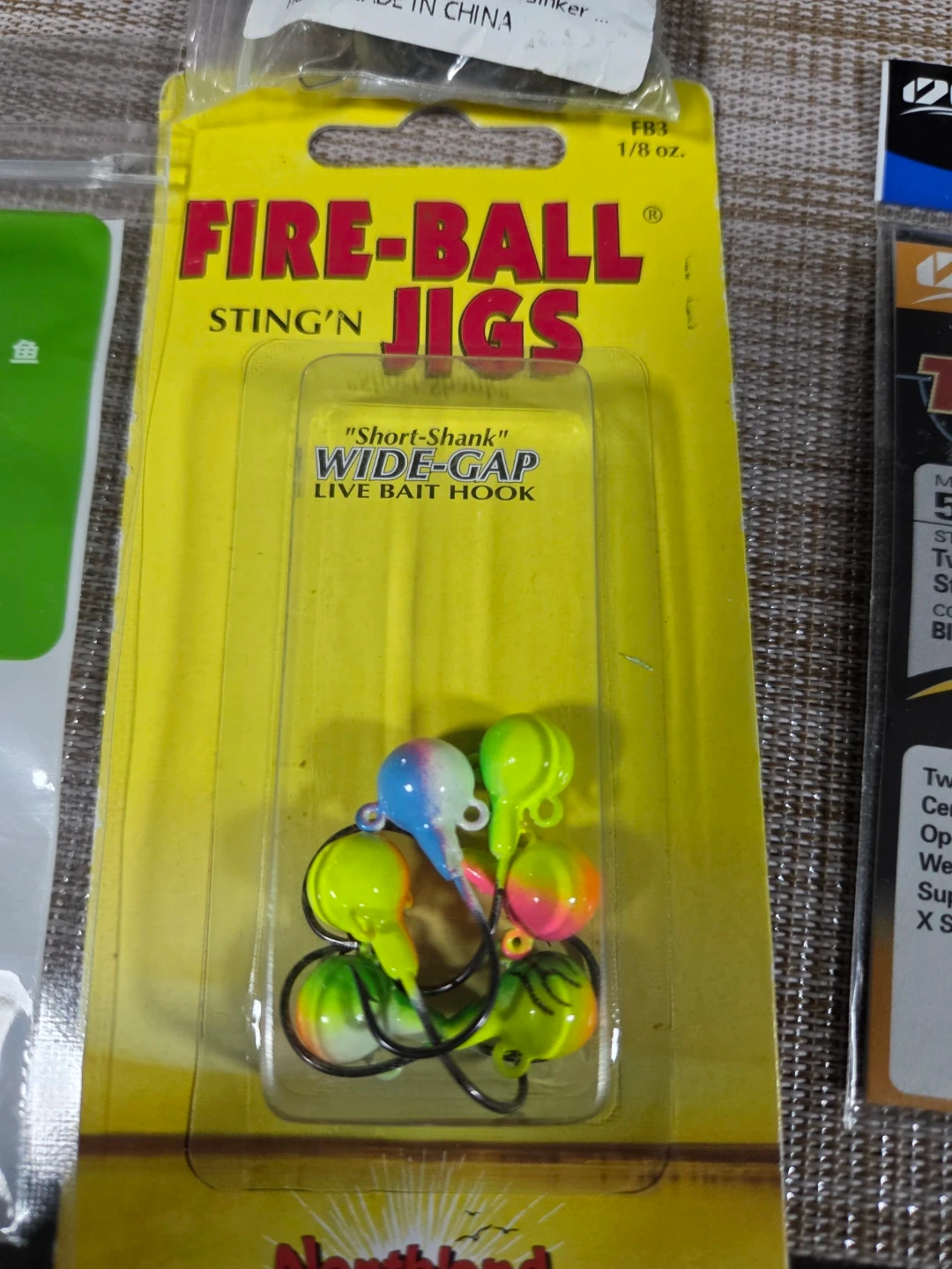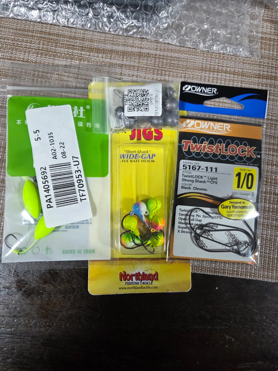 This lot includes Owner TwistLOCK wide gap live bait hooks, Fire-Ball Jigs, and 10pcs Bullet Weights Sinker. Also contains some green fishing floats and a Northland Fishing Tackle item. Everything you need for a successful fishing trip!