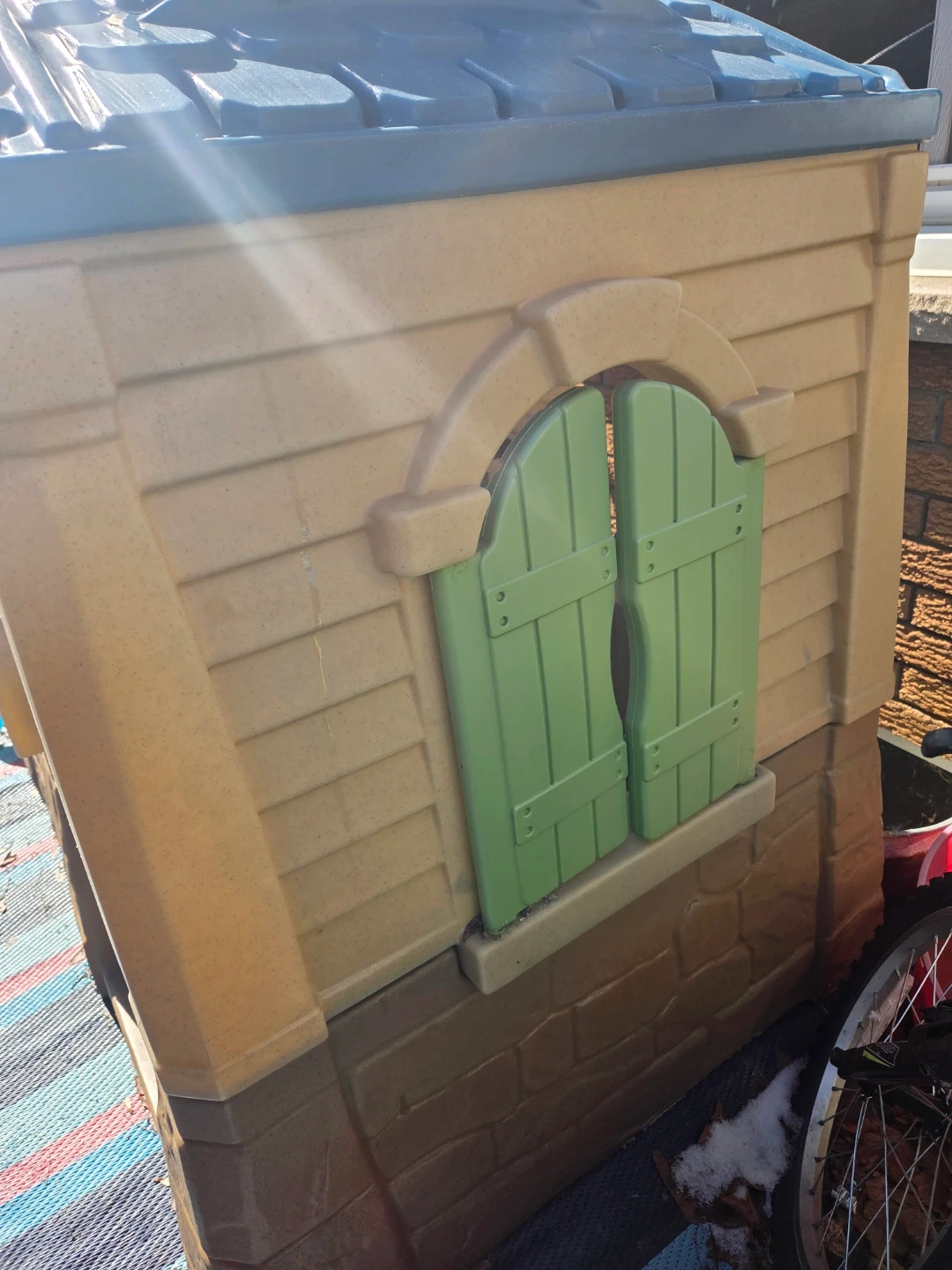 This is a used Little Tikes play house. It features a clock, fireplace and a sink with a grill. Great for outdoor play!