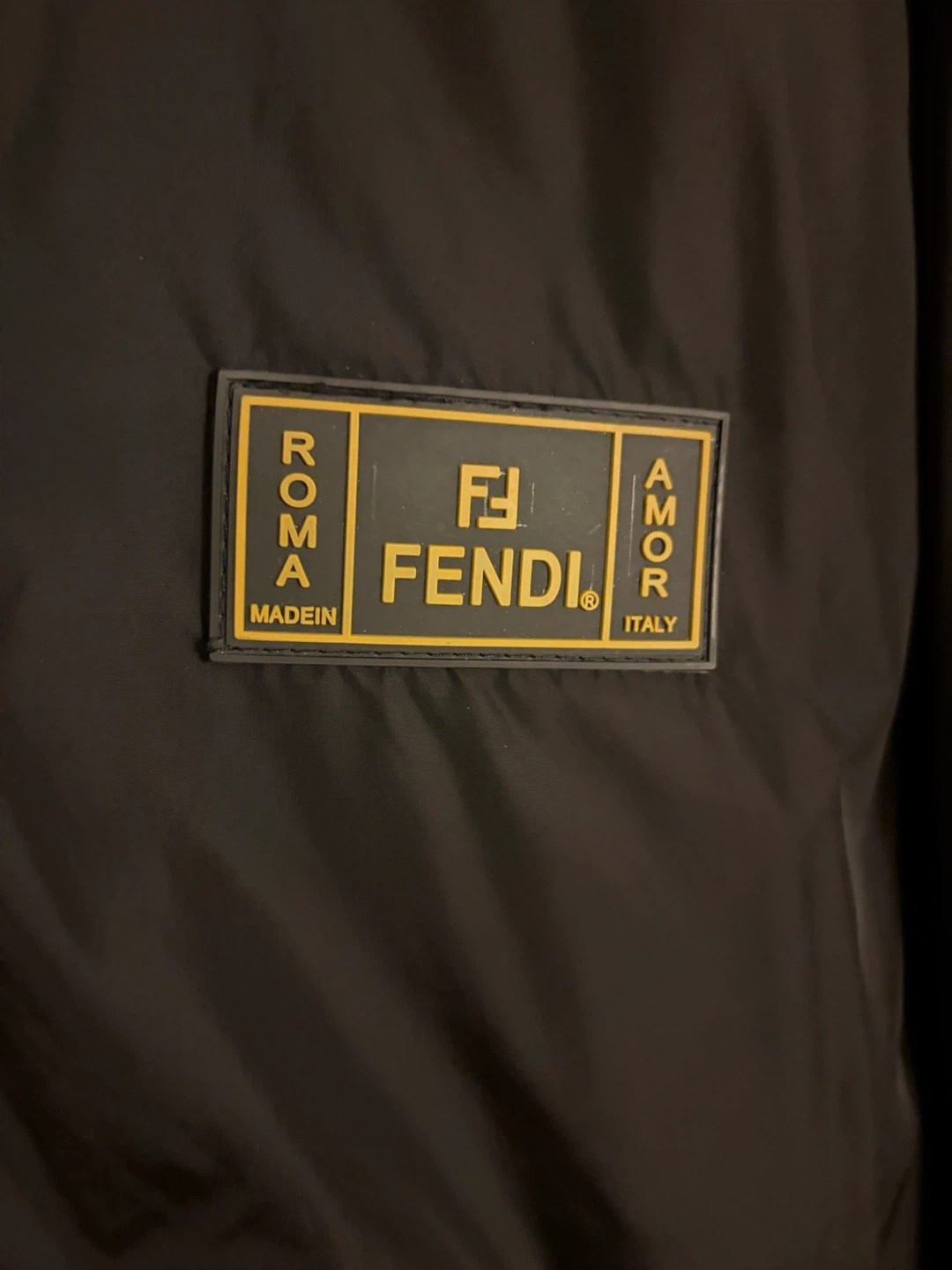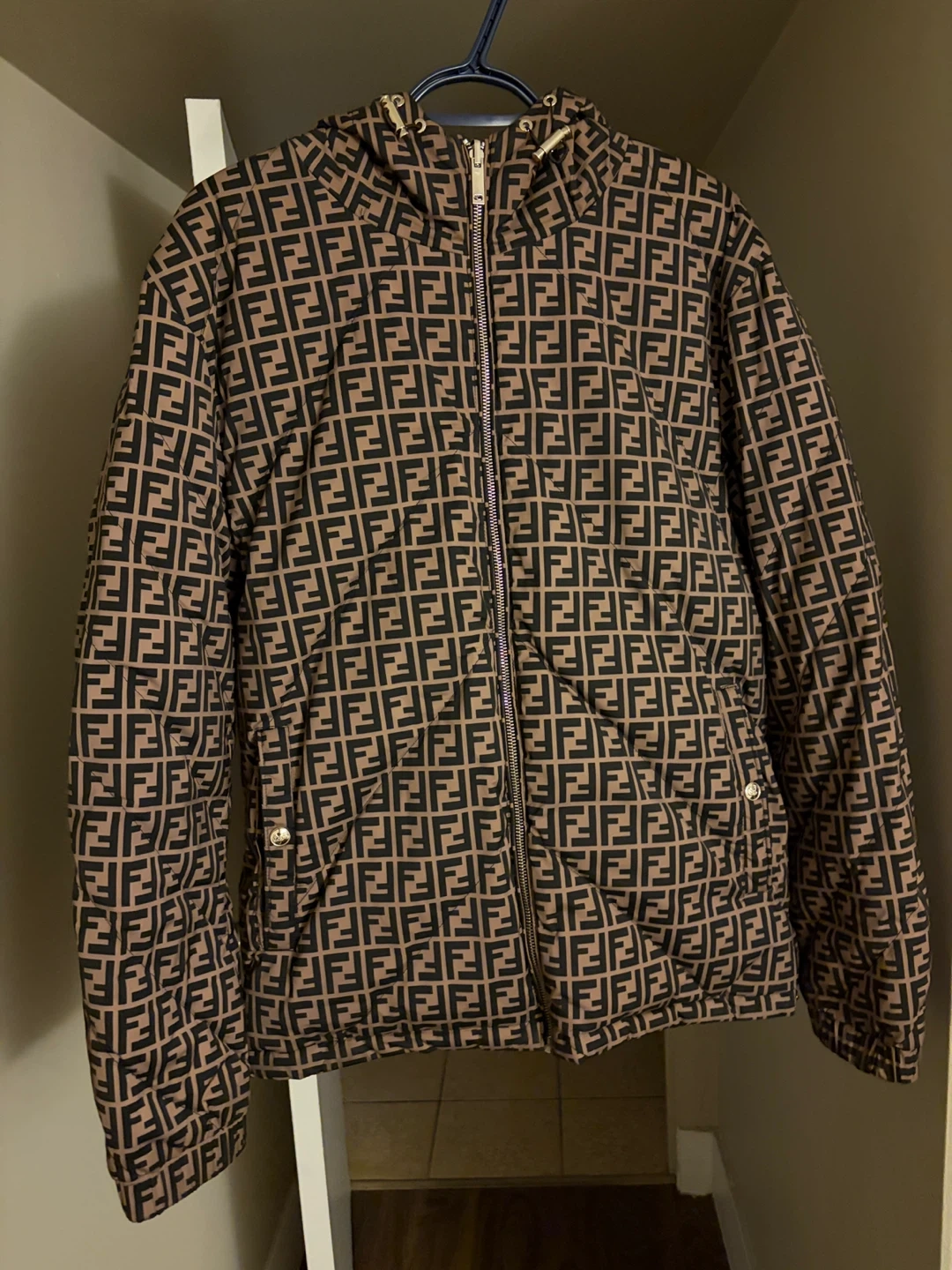 Selling a stylish Fendi jacket that's reversible! One side is black, and the other features the classic Fendi brown logo pattern. It's in great condition and ready for a new home. Will fit M- Xl sizes . Denim jacket comes as a gift.