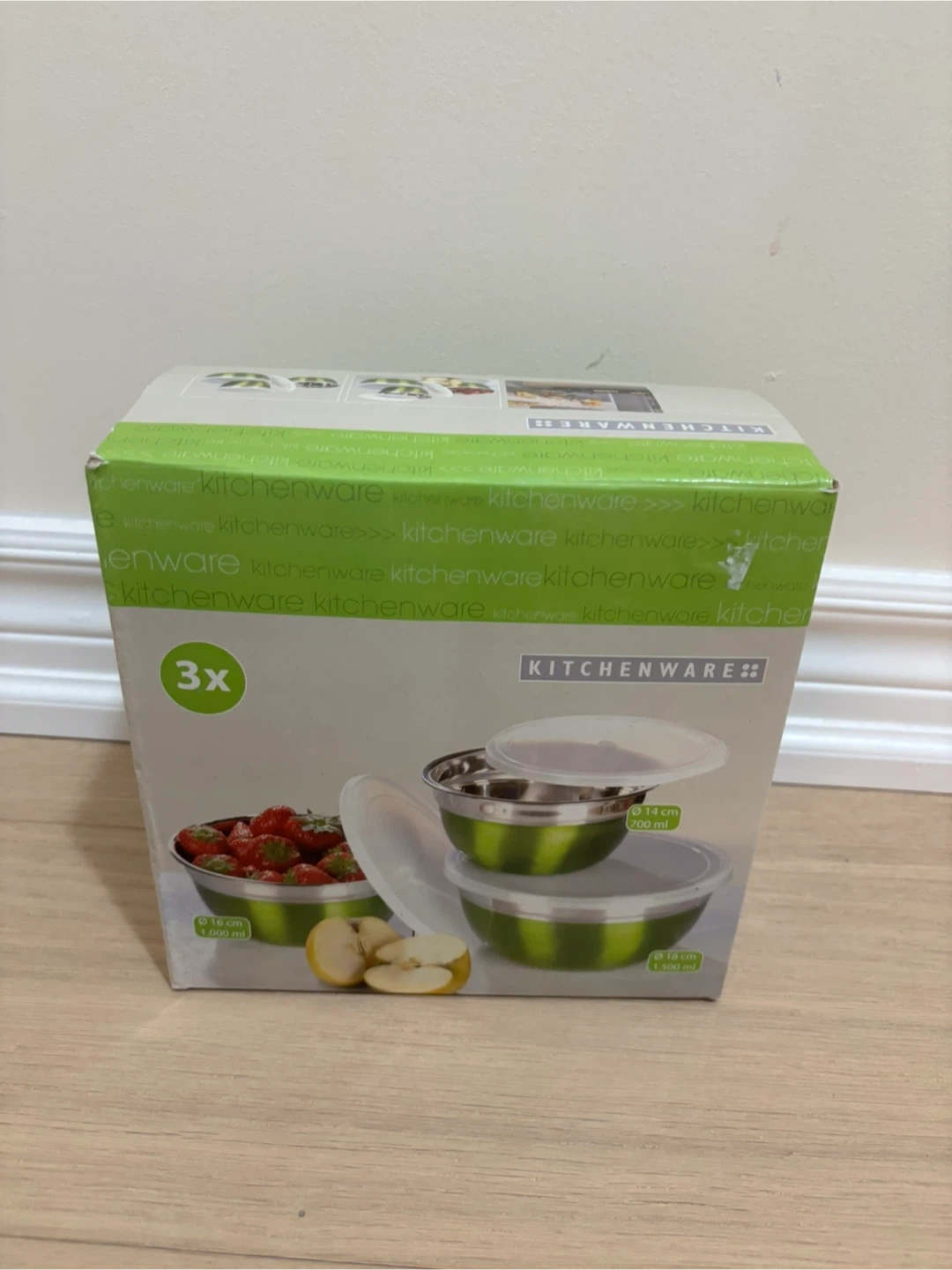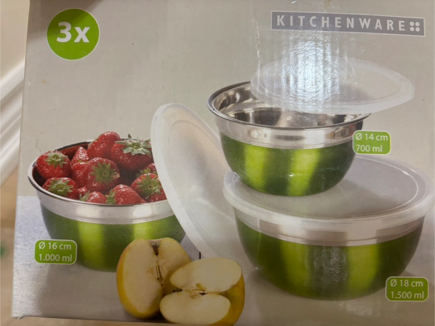 Set of three Kitchenware brand stainless steel mixing bowls. Includes three plastic lids for storage. Sizes are 16 cm (1.000 ml), 14 cm (700 ml),