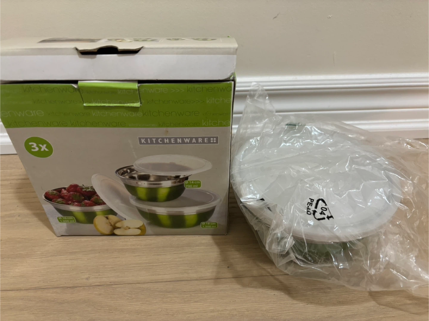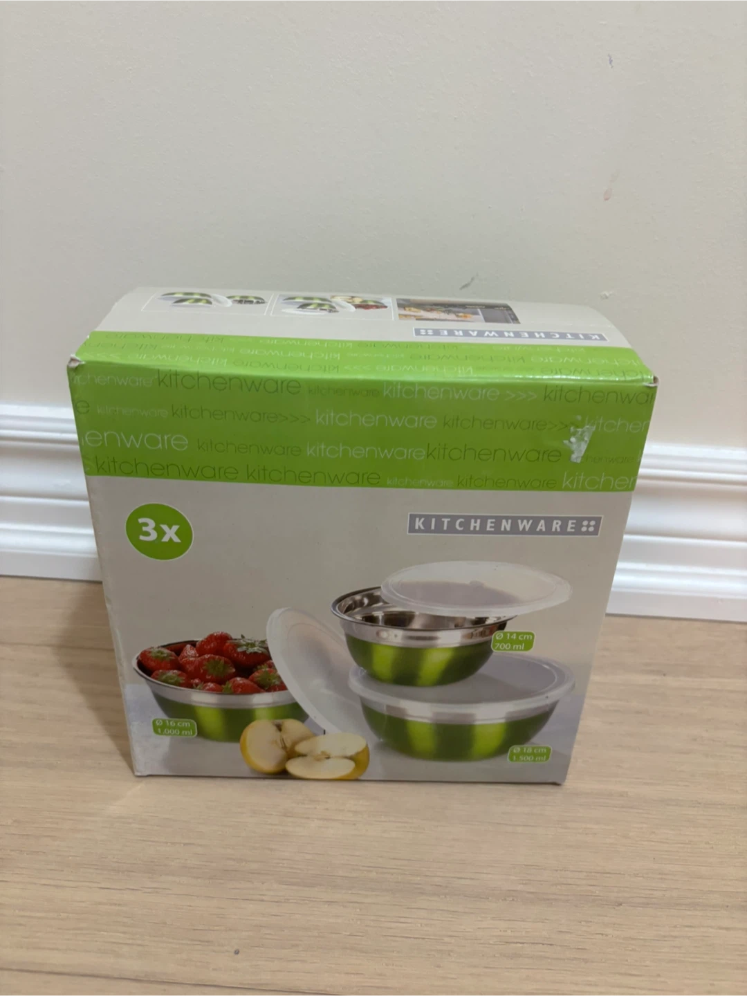 Set of three Kitchenware brand stainless steel mixing bowls. Includes three plastic lids for storage. Sizes are 16 cm (1.000 ml), 14 cm (700 ml),