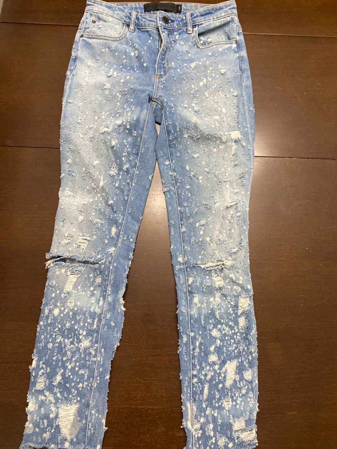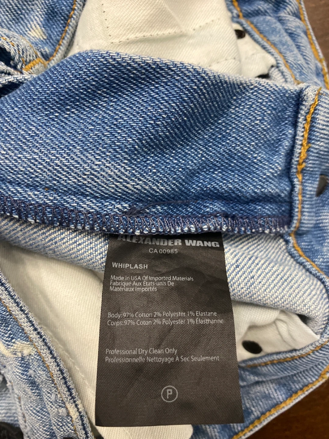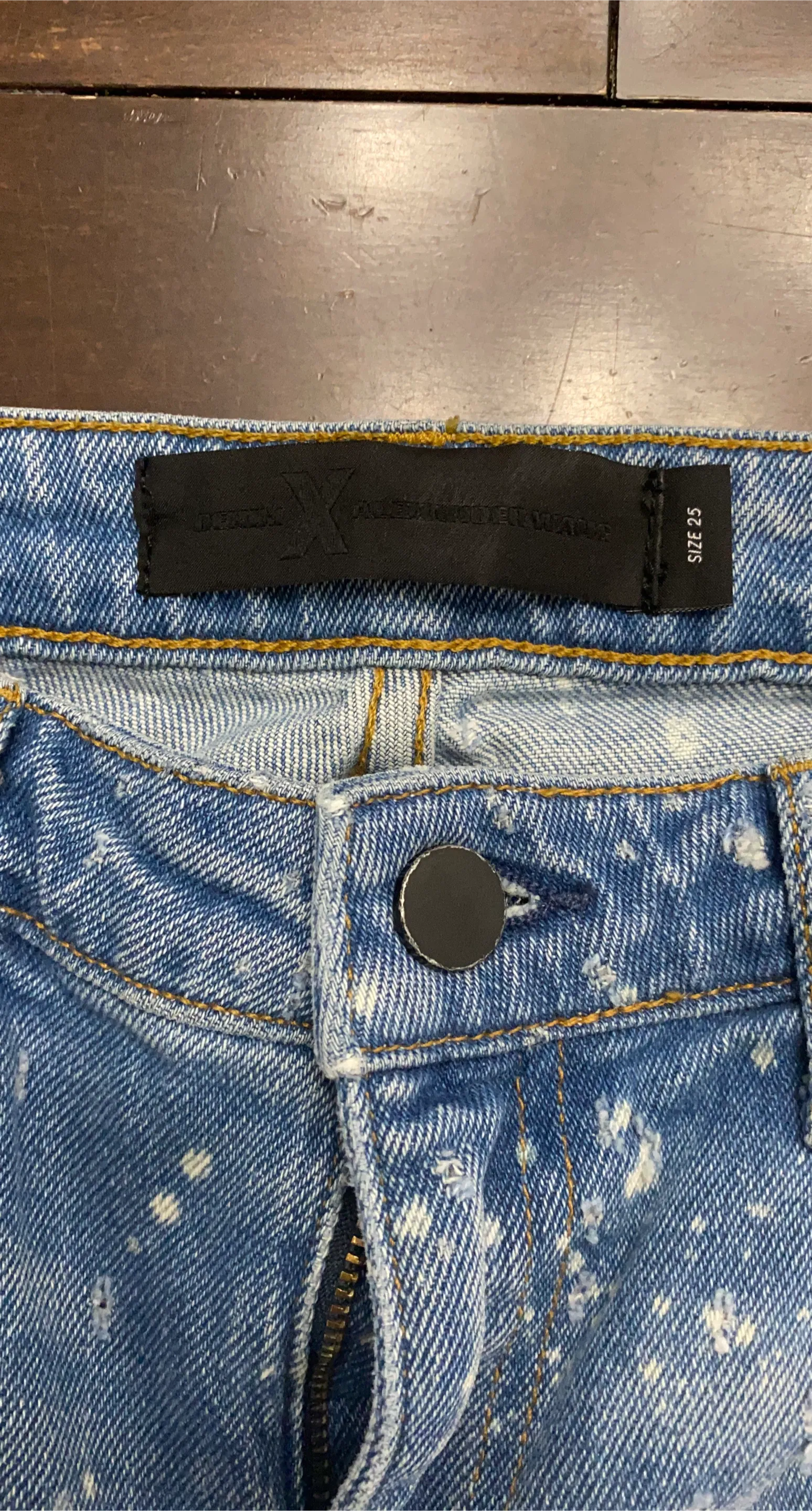 Alexander Wang denim jeans with a distressed, bleach-splatter design. Size 25. These jeans have a unique, edgy look with ripped details throughout.