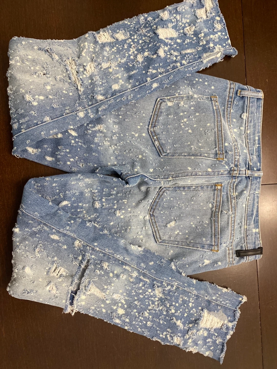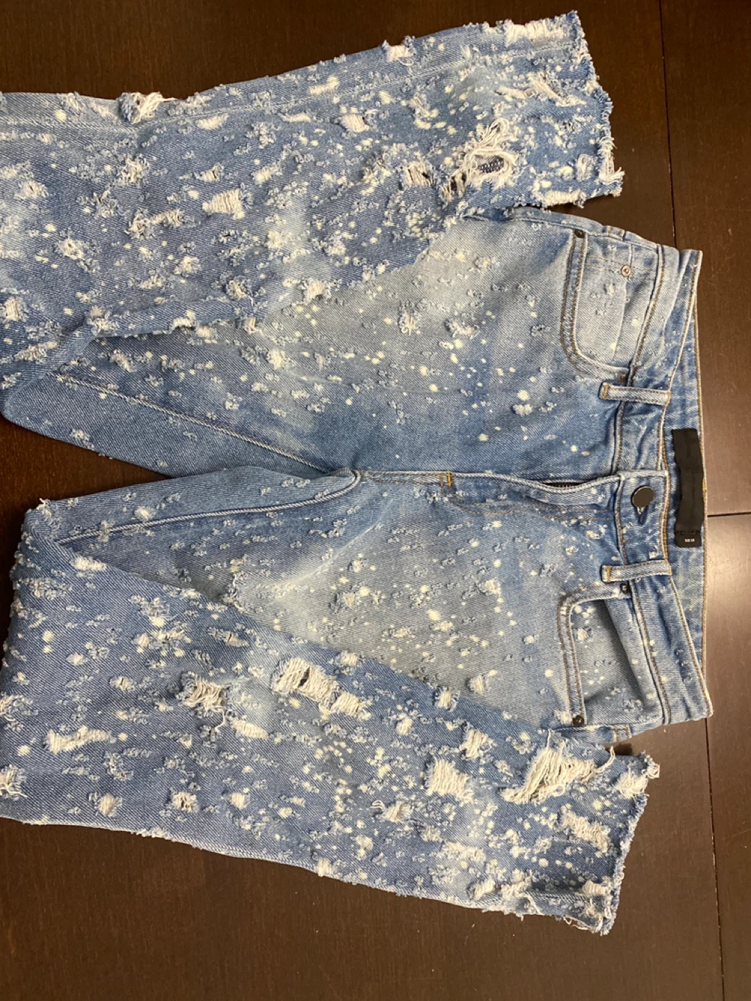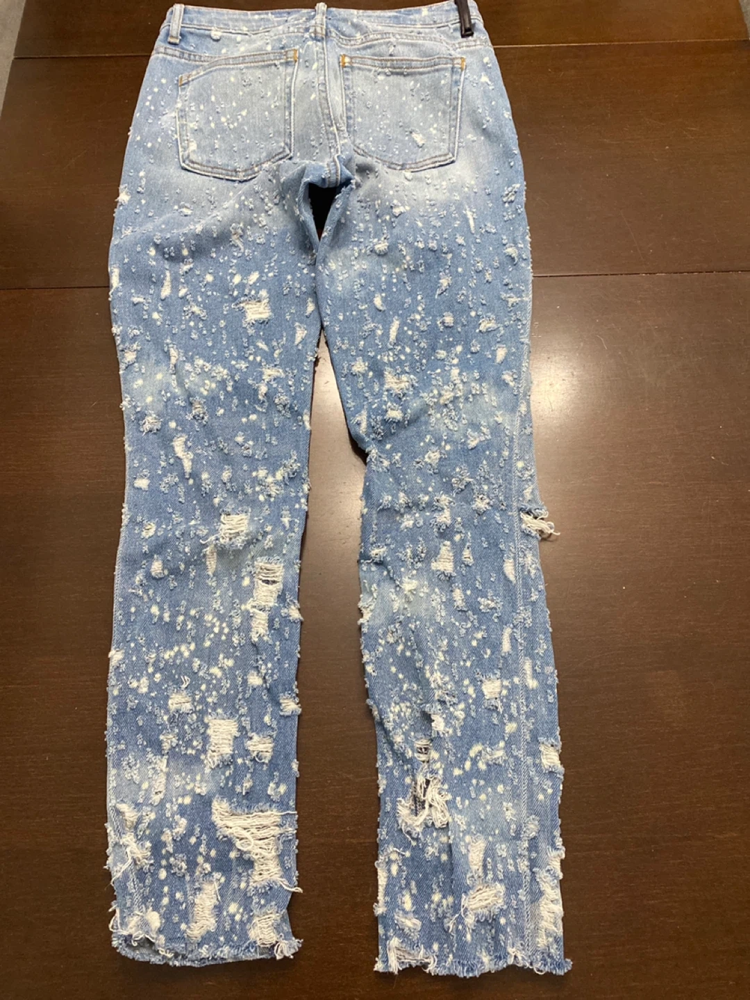 Alexander Wang denim jeans with a distressed, bleach-splatter design. Size 25. These jeans have a unique, edgy look with ripped details throughout.