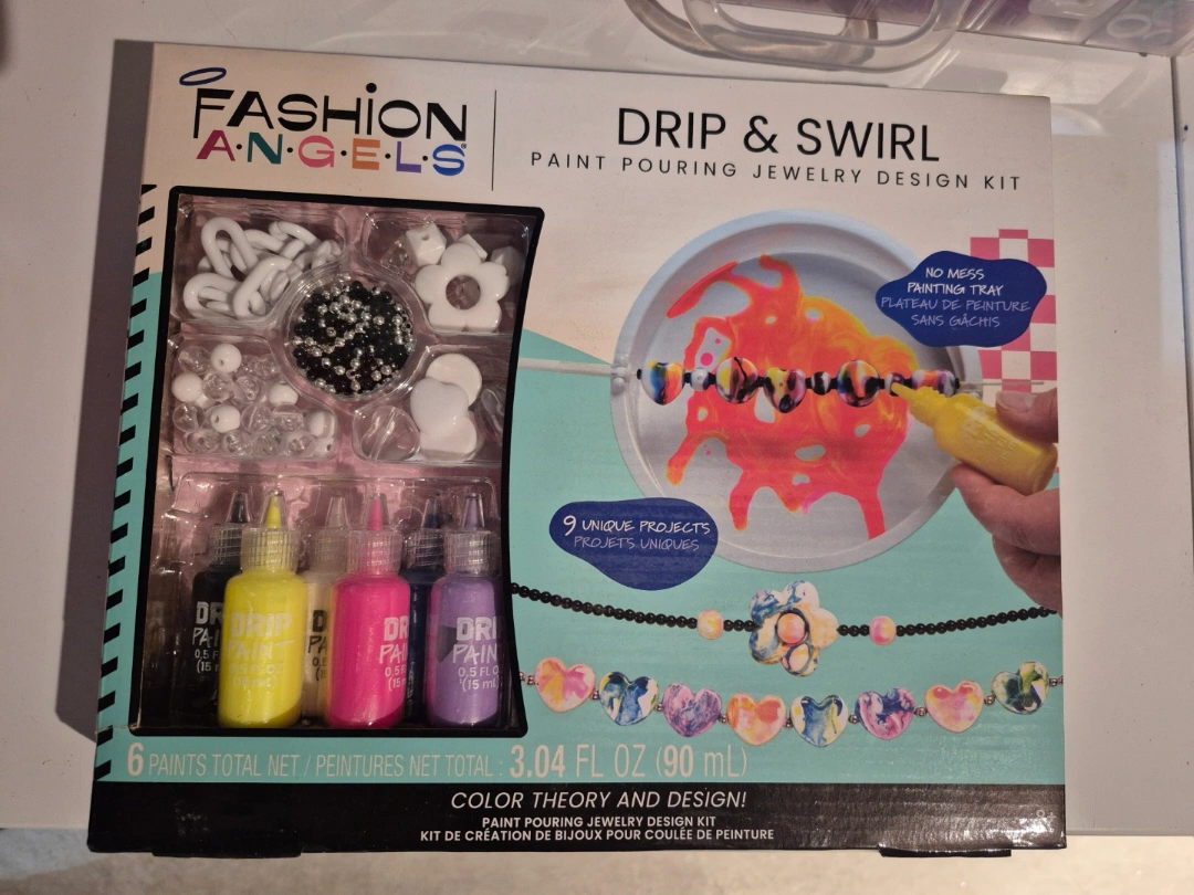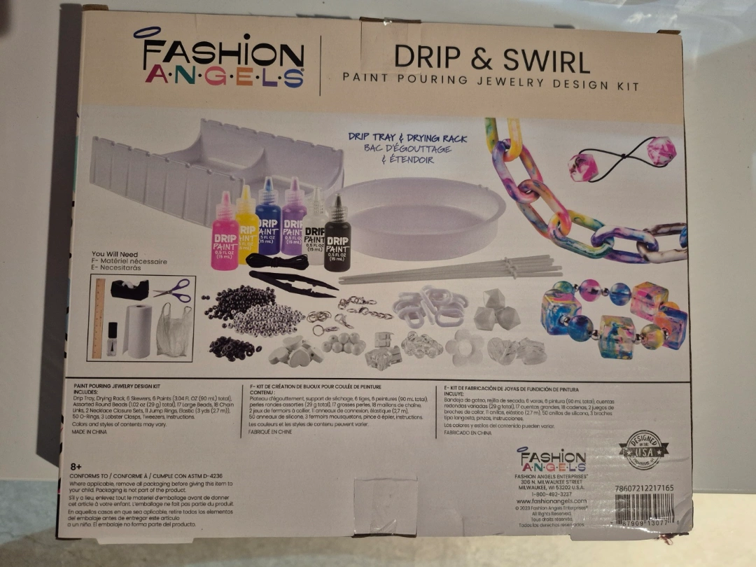 New, unopened Fashion Angels Drip & Swirl Paint Pouring Jewelry Design Kit. Includes paints, beads, and all necessary tools to create unique jewelry. Nine projects.