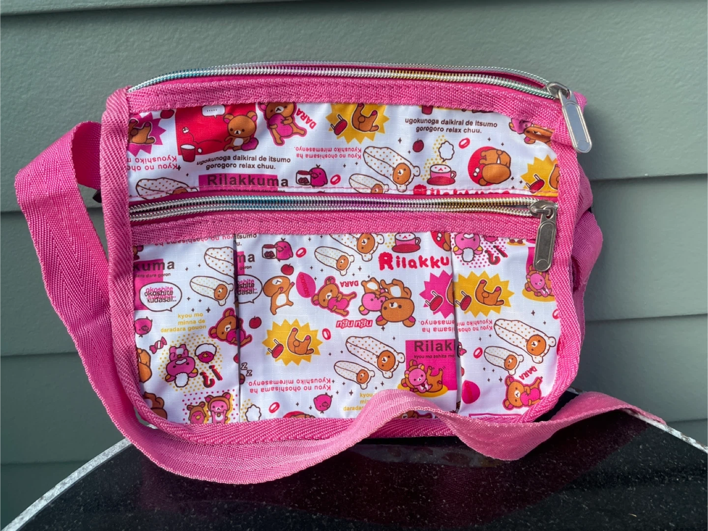 This Rilakkuma crossbody bag features a fun pattern with the characters. It has multiple zippered compartments for storage. Pink adjustable strap included. 9.5” width