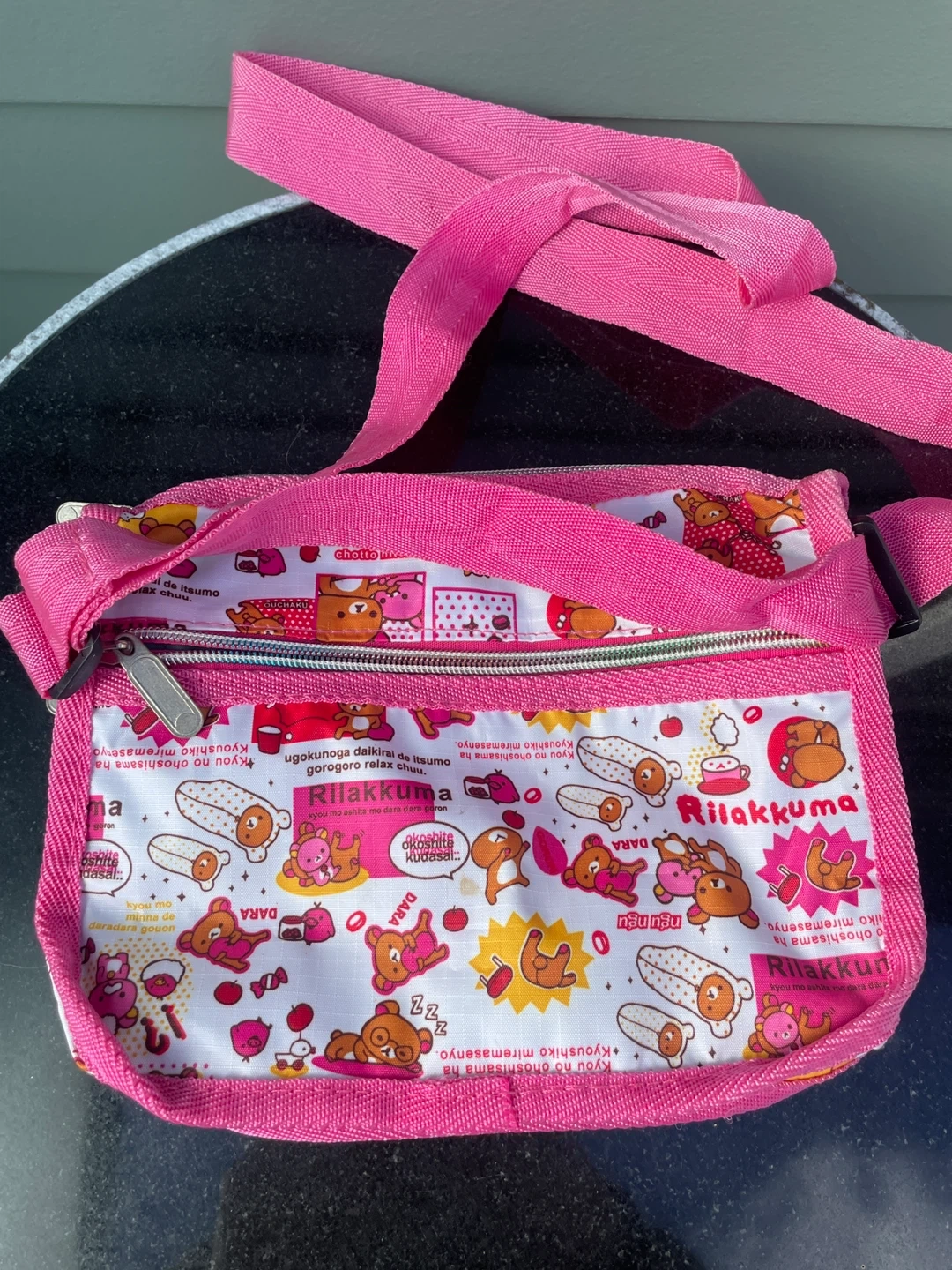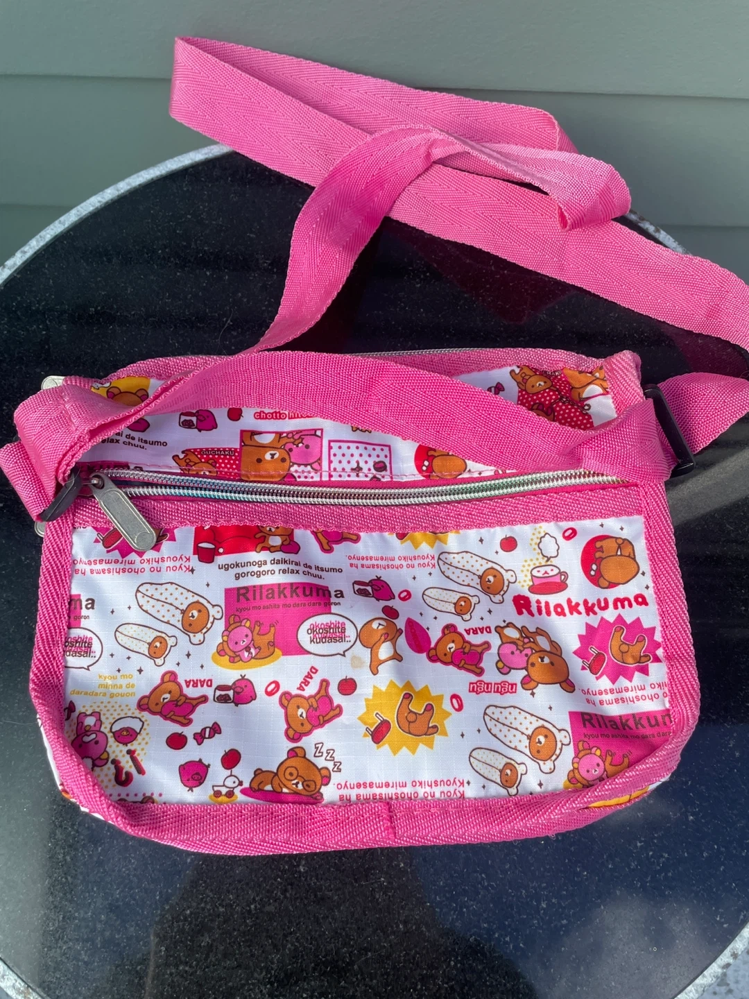 This Rilakkuma crossbody bag features a fun pattern with the characters. It has multiple zippered compartments for storage. Pink adjustable strap included. 9.5” width