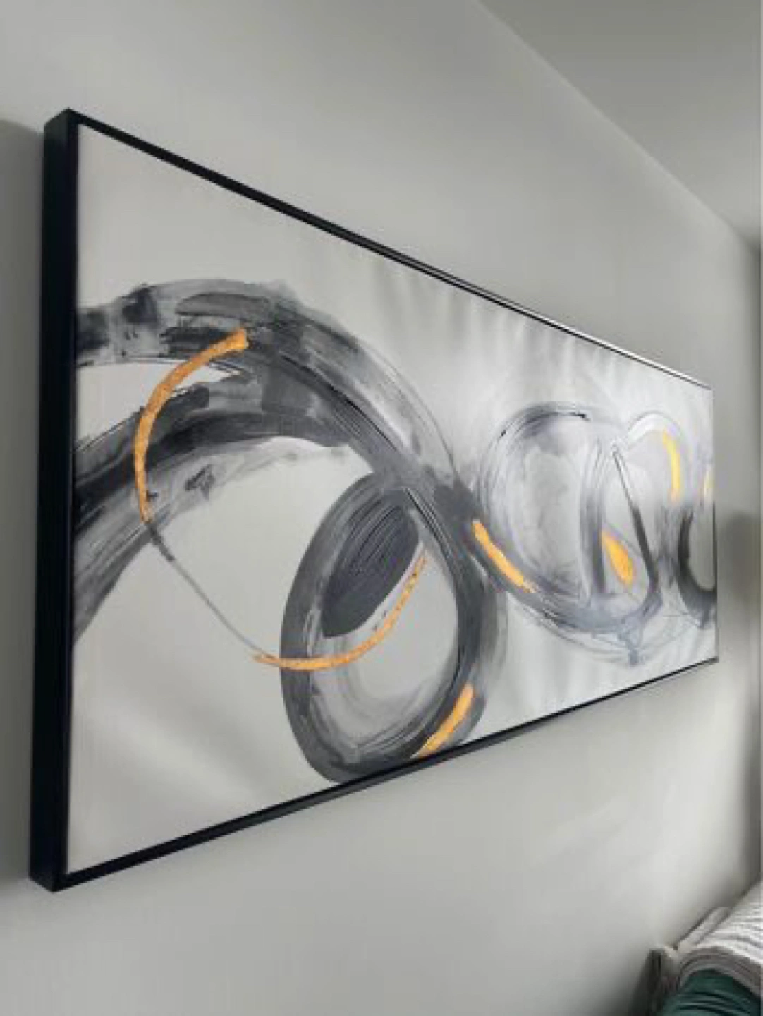 Excellent condition, super cute large abstract painting. White canvas with textured black paint and gold accents. Black frame.