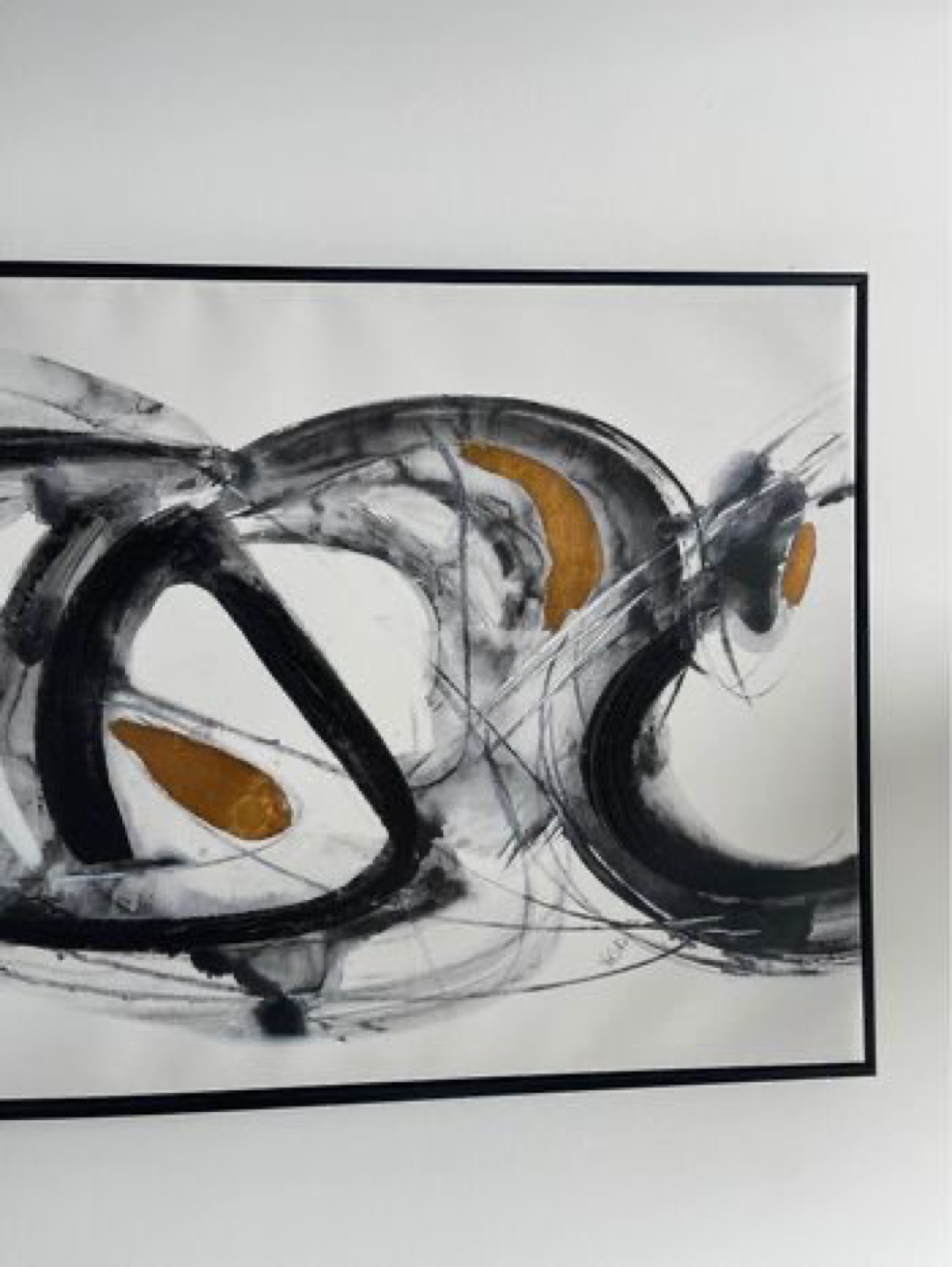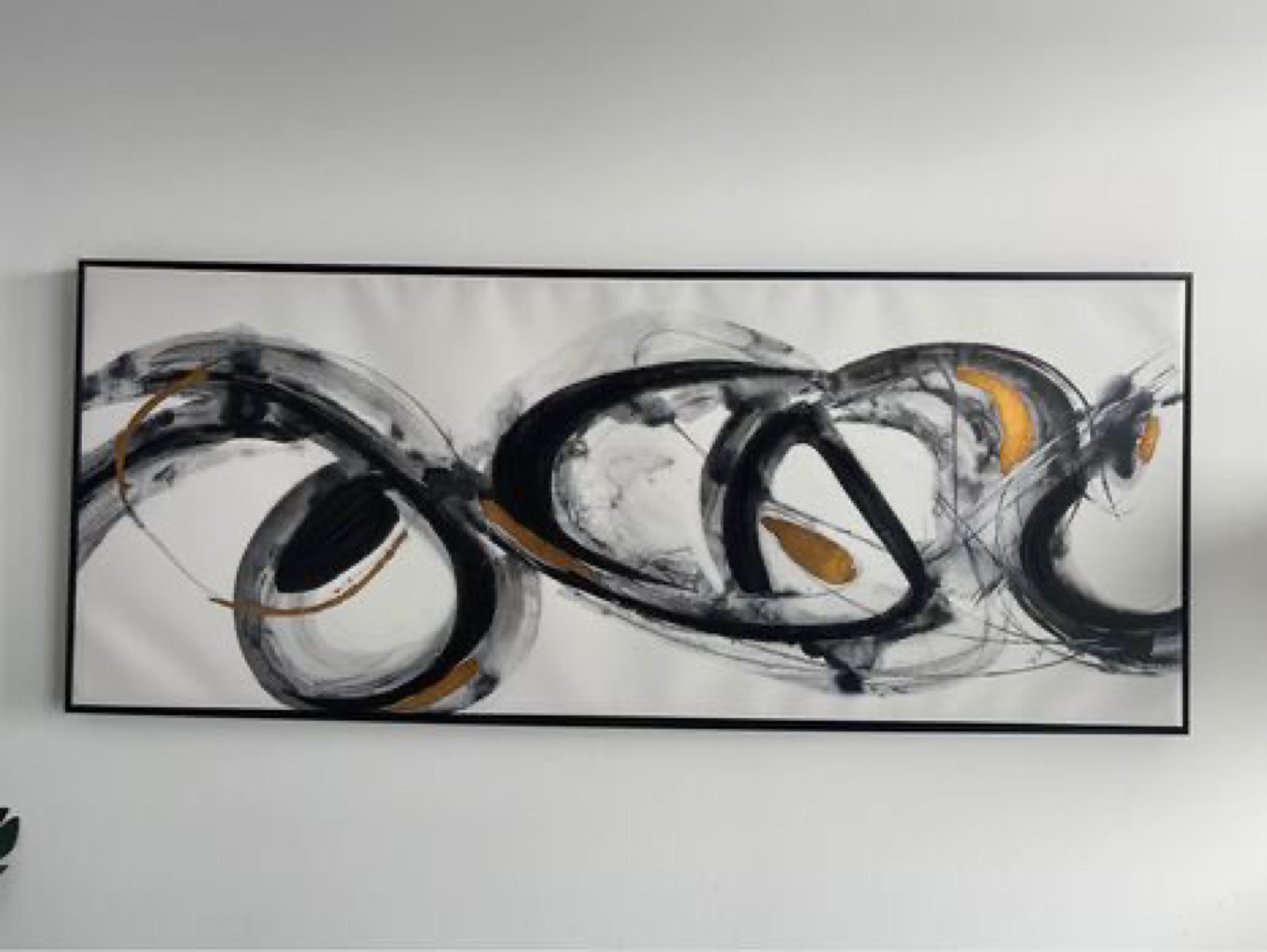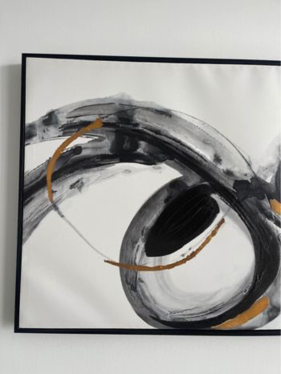 Excellent condition, super cute large abstract painting. White canvas with textured black paint and gold accents. Black frame.