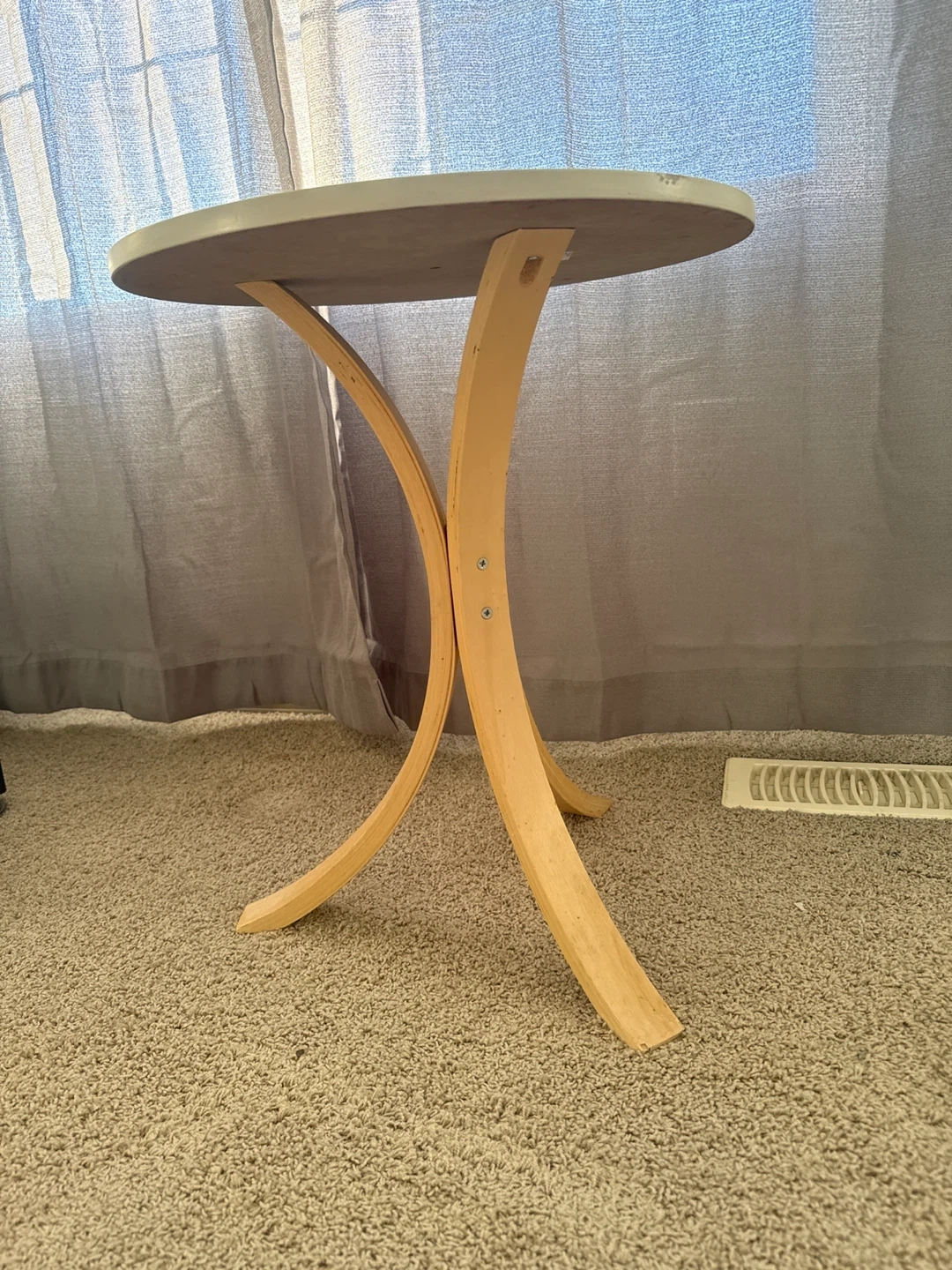 A simple round side table with a light-coloured top and light wood curved legs. It's a handy accent piece for any room. Its compact size makes it suitable for small spaces.
