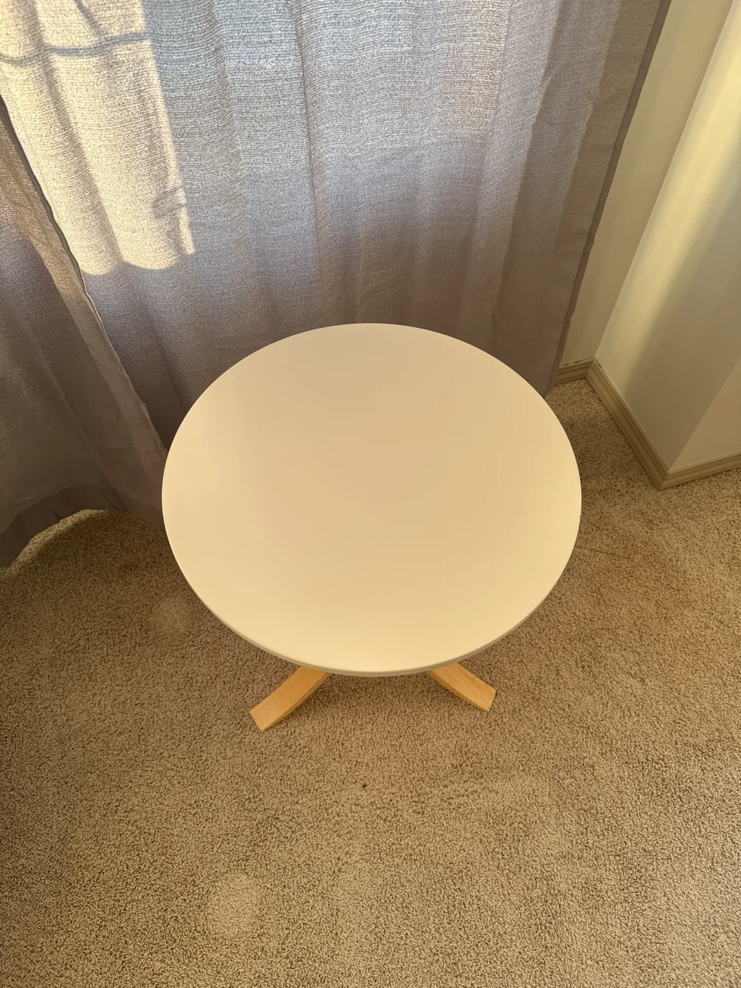 A simple round side table with a light-coloured top and light wood curved legs. It's a handy accent piece for any room. Its compact size makes it suitable for small spaces.