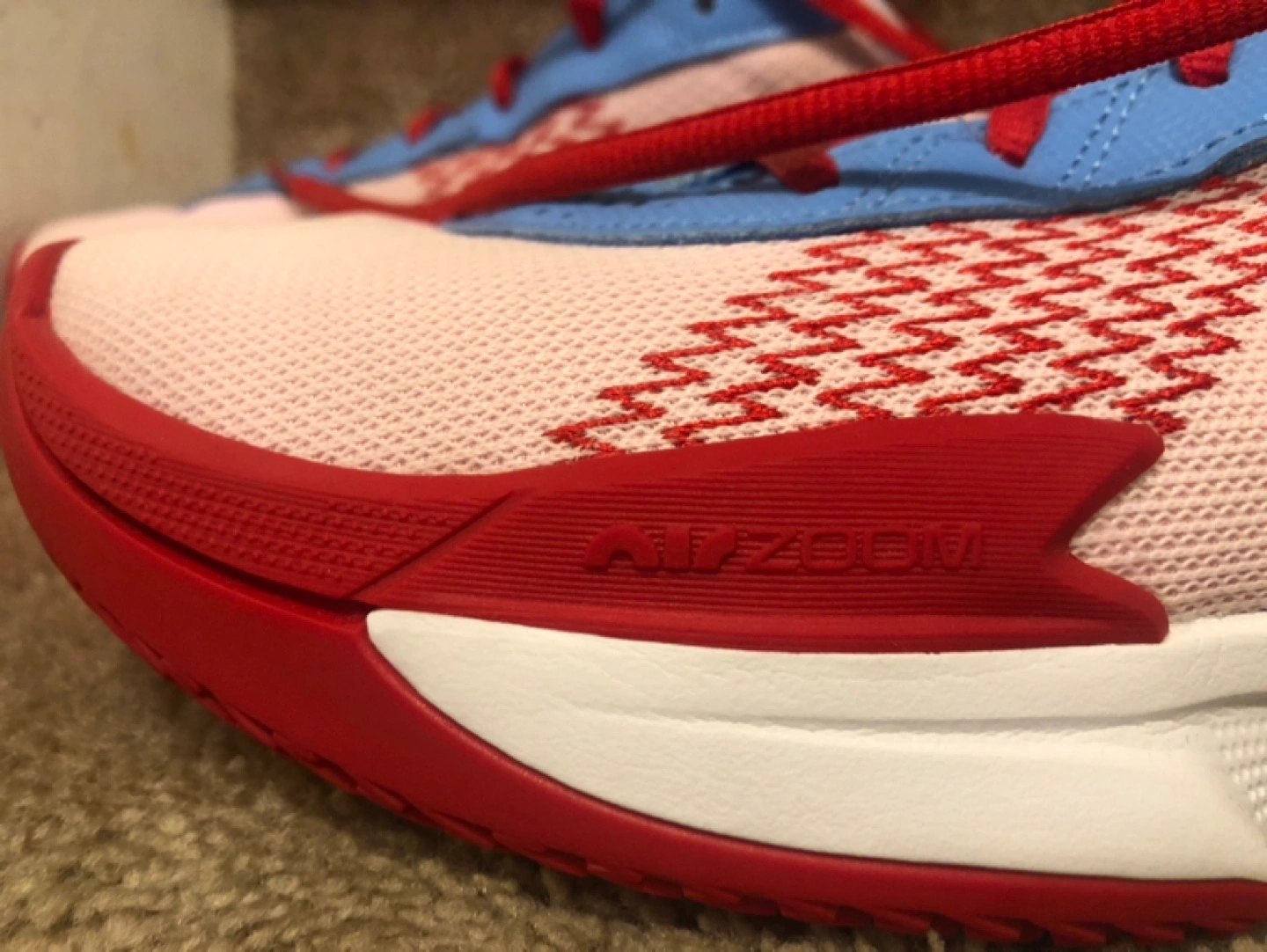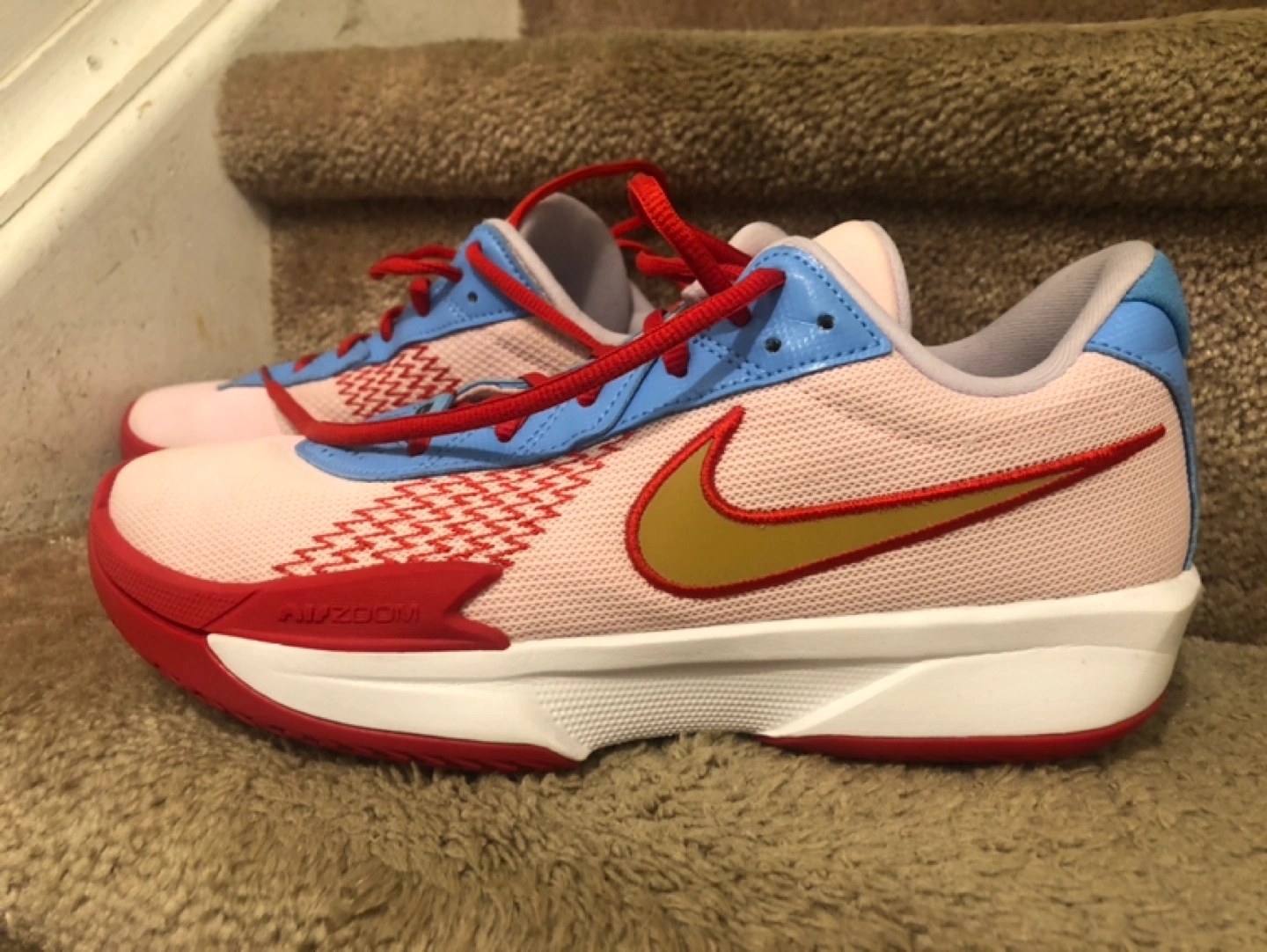 Selling a pair of Nike G.T. Cut ZEE9 basketball shoes! They feature Air Zoom technology and a unique design with red, white, and blue accents. Perfect for hitting the court in style!