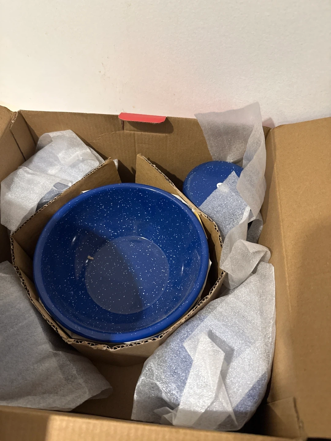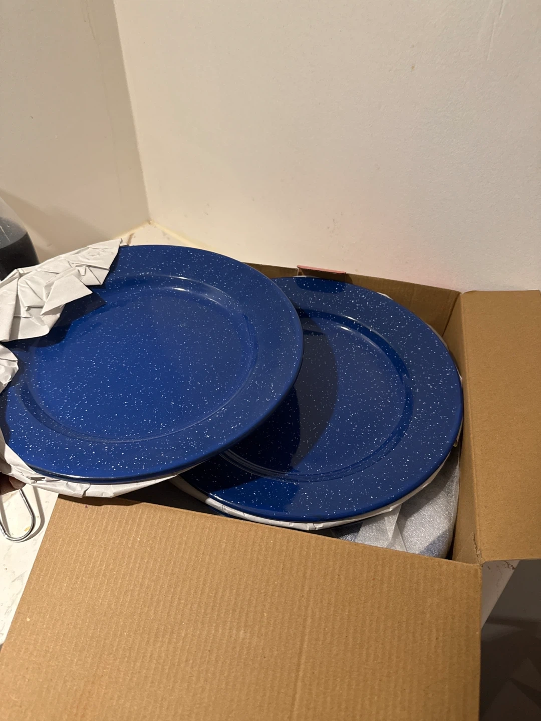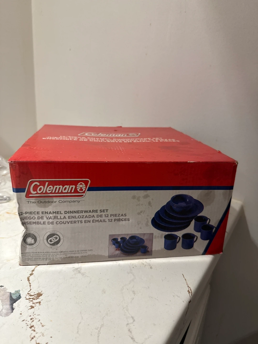This Coleman 12-piece enamel dinnerware set is includes four 10.5-inch plates, four 6-inch bowls, and four 12-ounce mugs. The durable enamel construction makes it ideal for eating at home, camping and picnics!