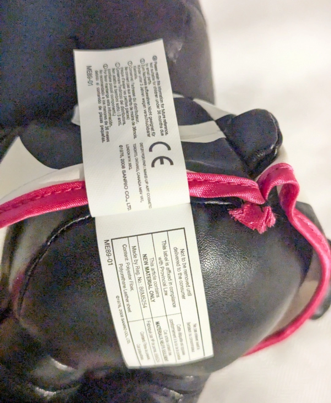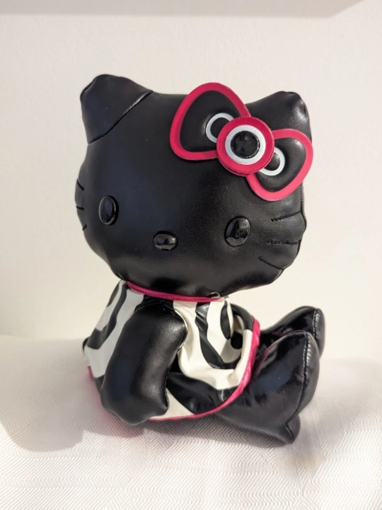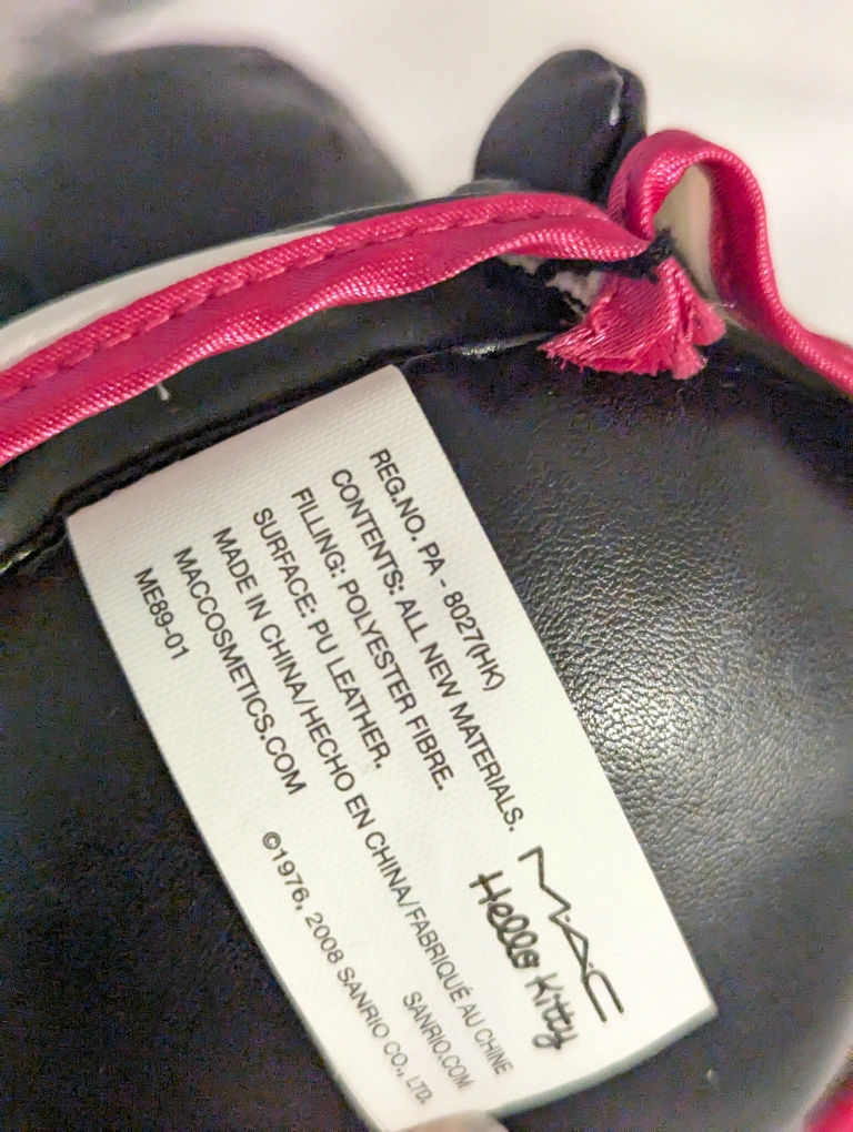 Collectible Hello Kitty plush in collaboration with MAC cosmetics. Black faux leather. Pink accents on dress and bow. 8" tall.