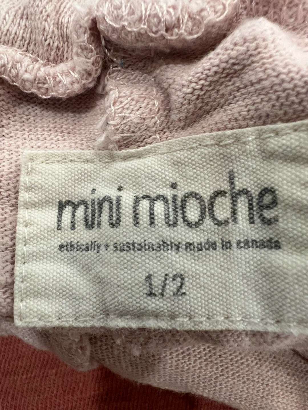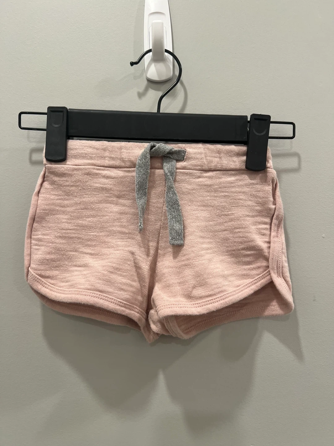Preloved Mini Mioche shorts made from 100% organic cotton. Features a pink colour and a drawstring waist. Ethically and sustainably made in Canada. Size- 1/2 years