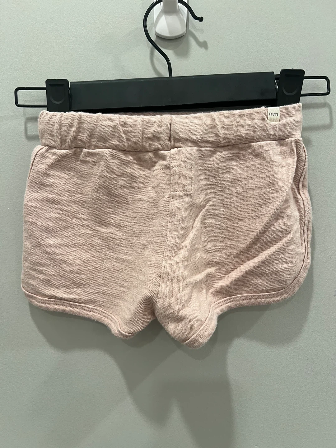 Preloved Mini Mioche shorts made from 100% organic cotton. Features a pink colour and a drawstring waist. Ethically and sustainably made in Canada. Size- 1/2 years