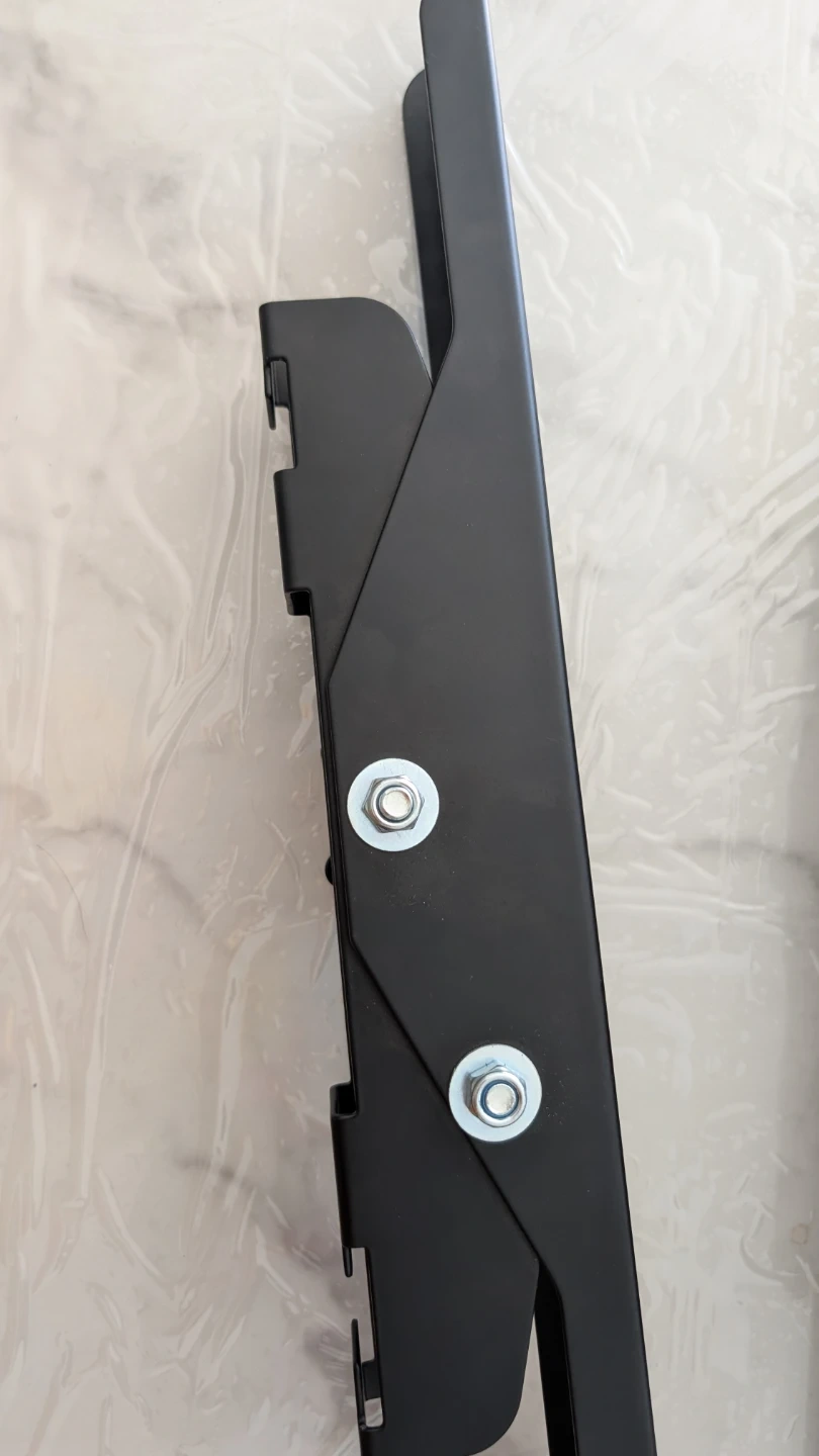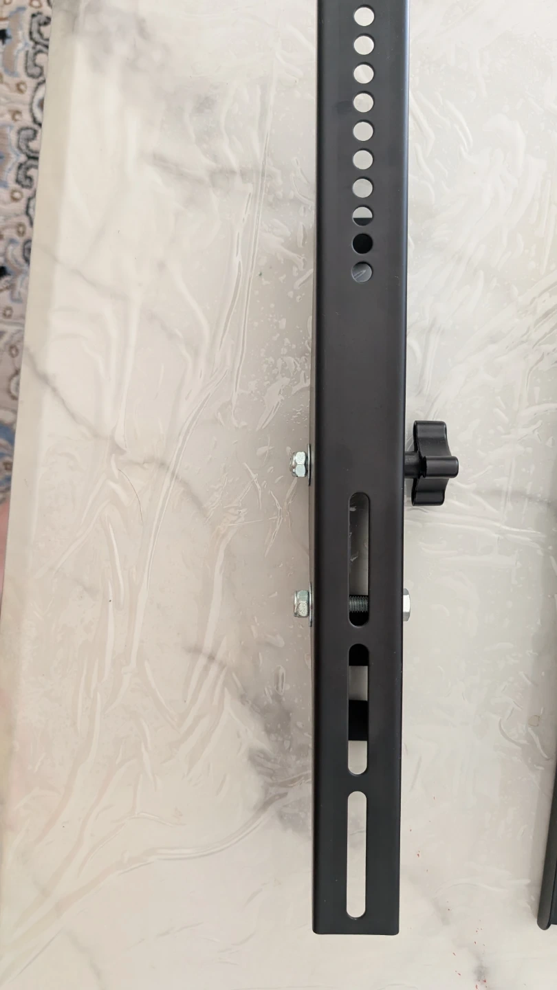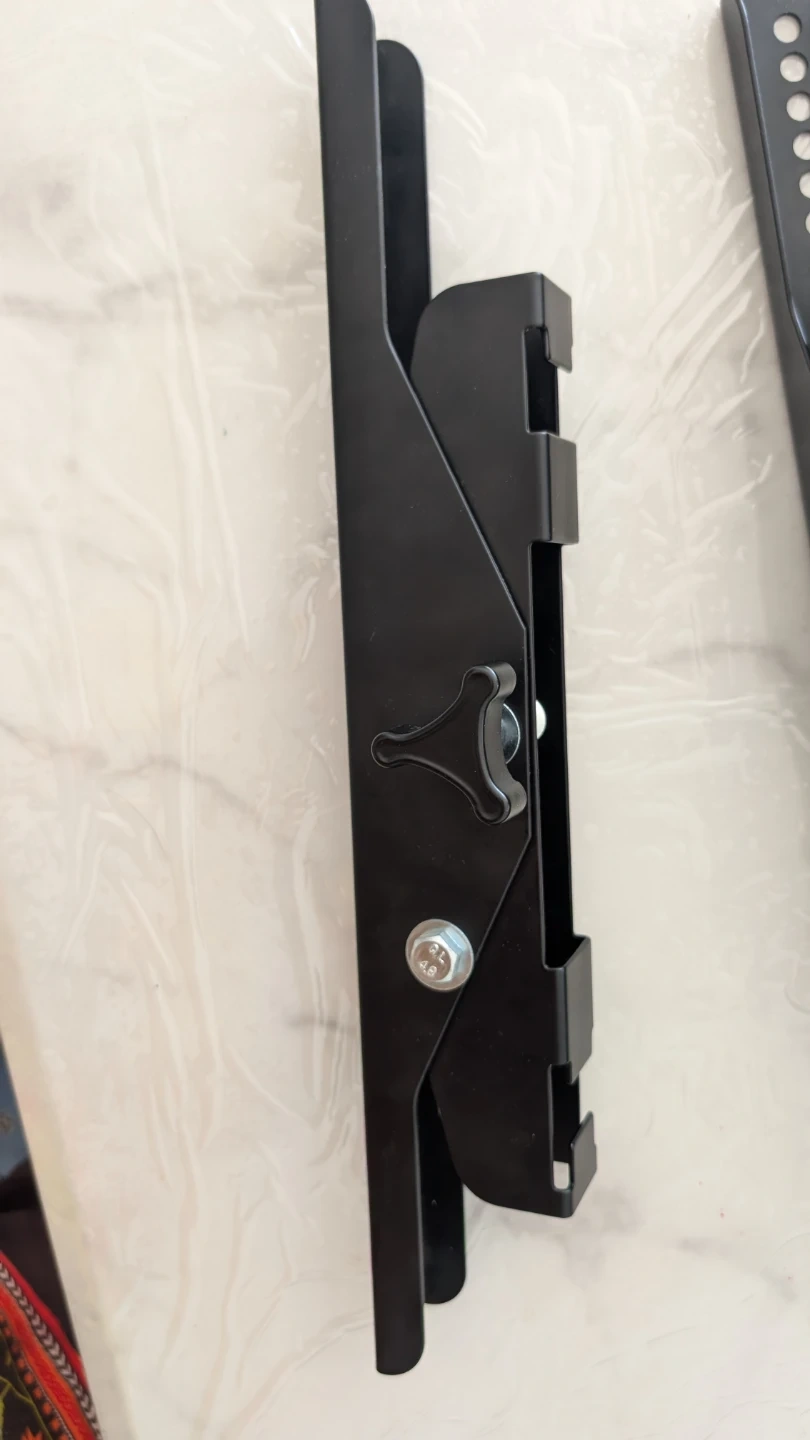 These are black metal TV wall mount brackets. They're made of sturdy metal and include adjustable knobs. These brackets are great for mounting a TV to the wall.