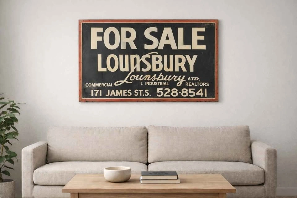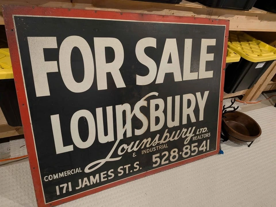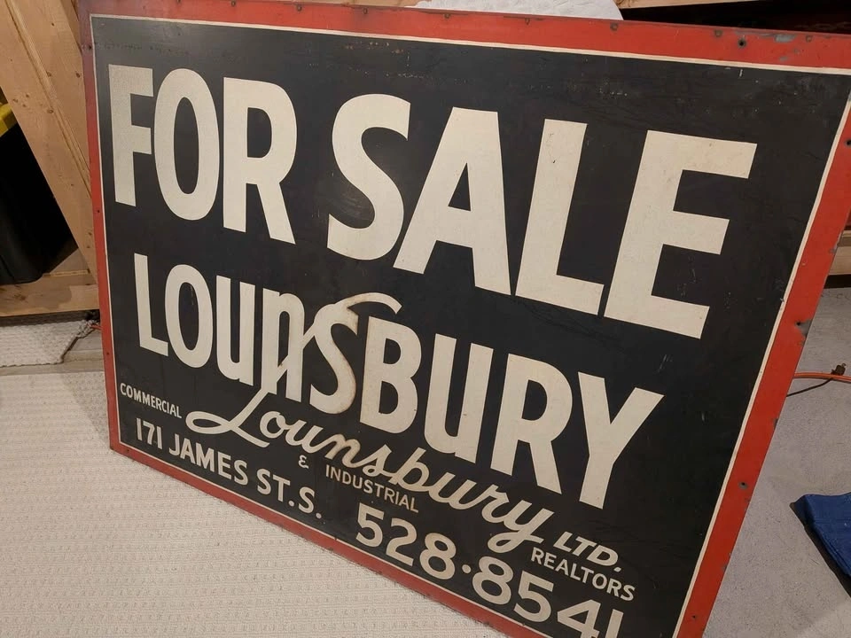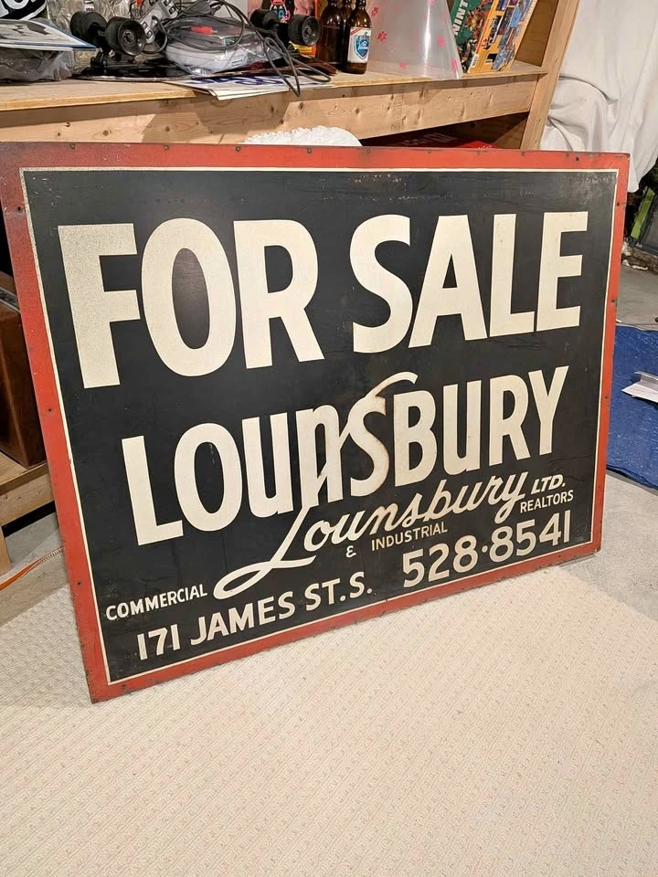 Vintage Hand-Painted on tin metal with wood frame Lounsbury LTD real estate sign, a cool piece of local history. The sign is in fair condition, showing its age, but that adds to its vintage charm. It would look great in a collection or as a unique decorative piece. Likely from the late 1950s early 1960s.