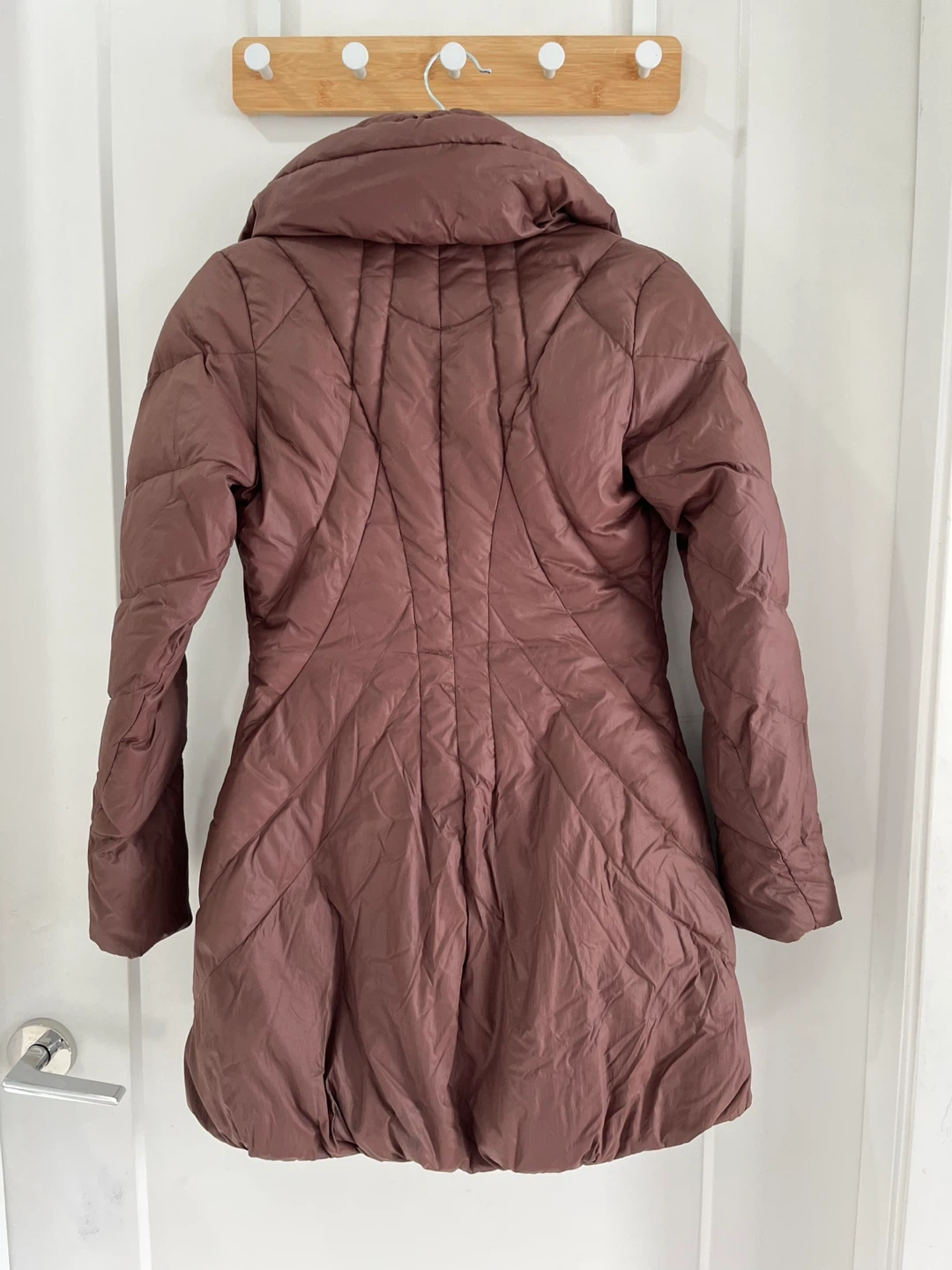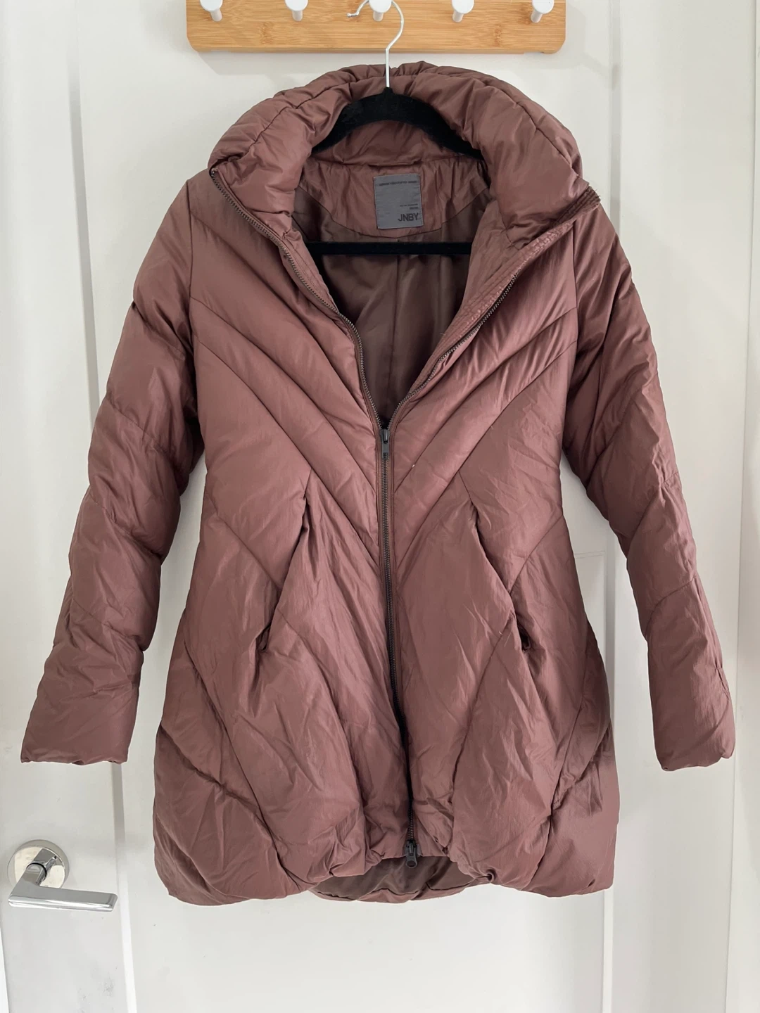 Selling a gently used JNBY puffer coat in a lovely brown colour. It's a size small and has a unique design with a high collar. Perfect for staying warm and stylish during the colder months!