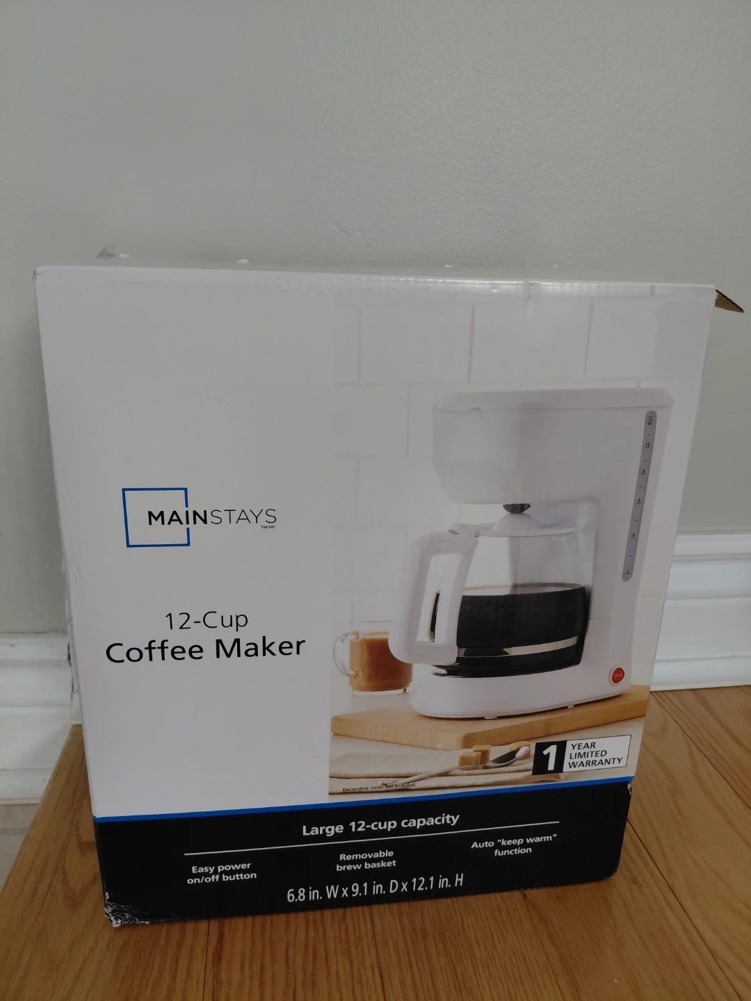 This is a brand new 12-cup coffee maker from Mainstays. It has a removable brew basket and an auto "keep warm" function. Its dimensions are 6.8 in. W x 9.1 in. D x 12.1 in. H. It's great for making coffee for a crowd!