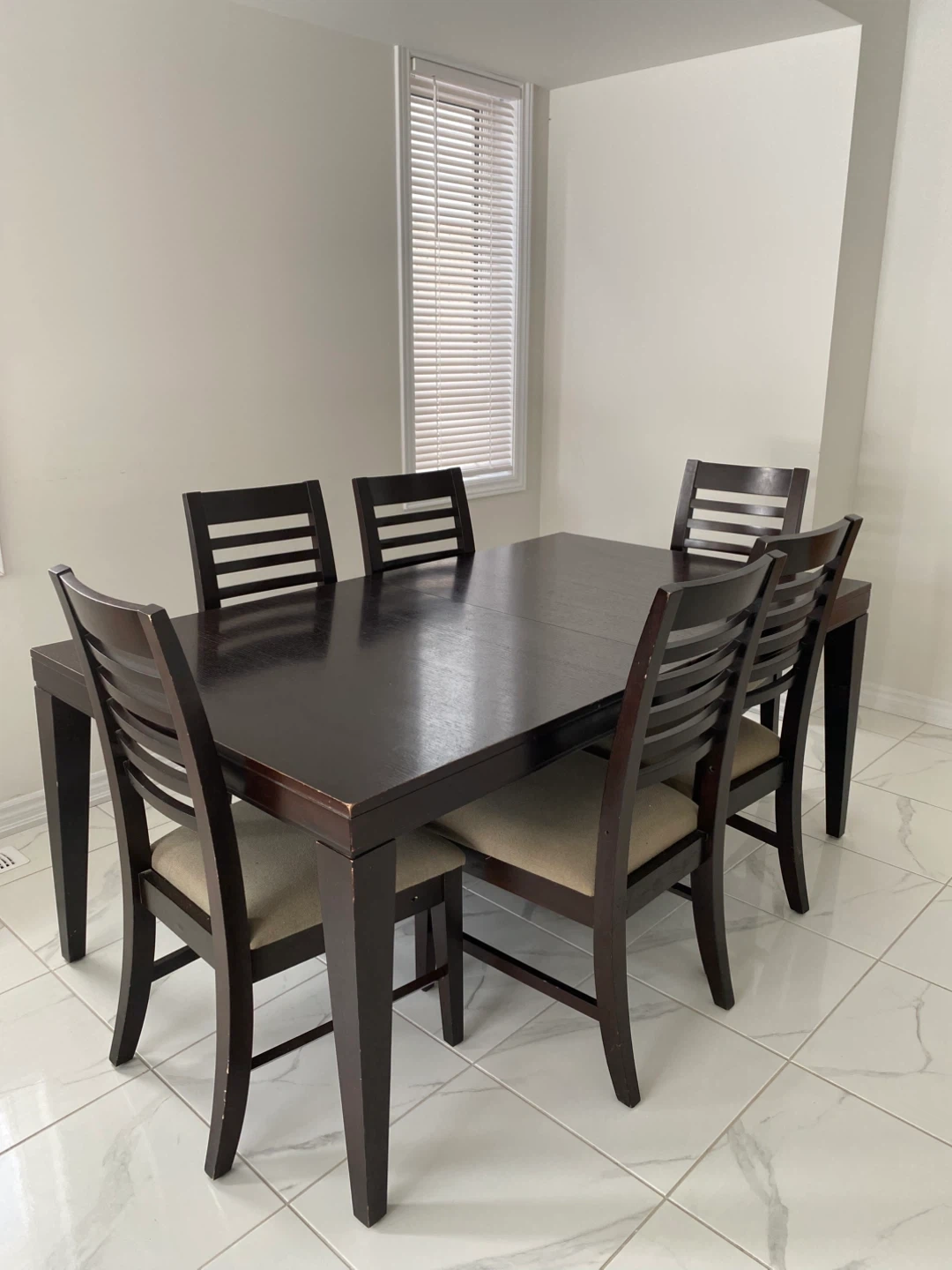 Dark wood dining table with six matching chairs. The chairs have upholstered seats for comfort. This set offers ample seating for family meals.