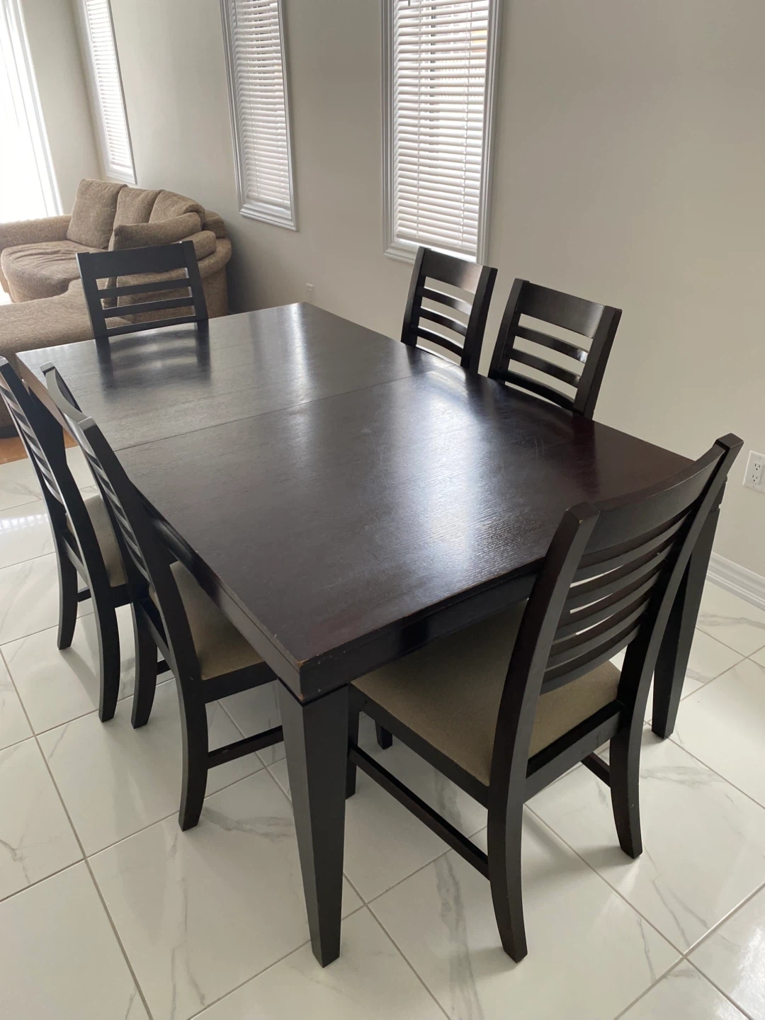 Dark wood dining table with six matching chairs. The chairs have upholstered seats for comfort. This set offers ample seating for family meals.
