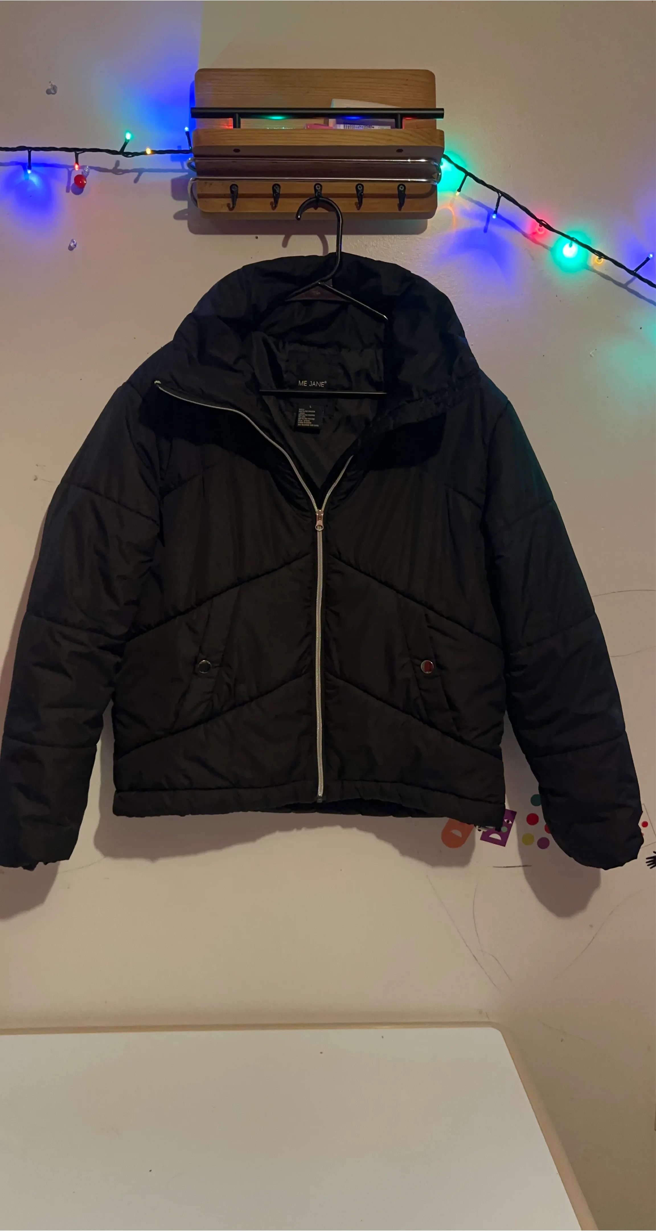 Here's a gently used ME JANE black puffer jacket in size L. It's perfect for staying warm and stylish!