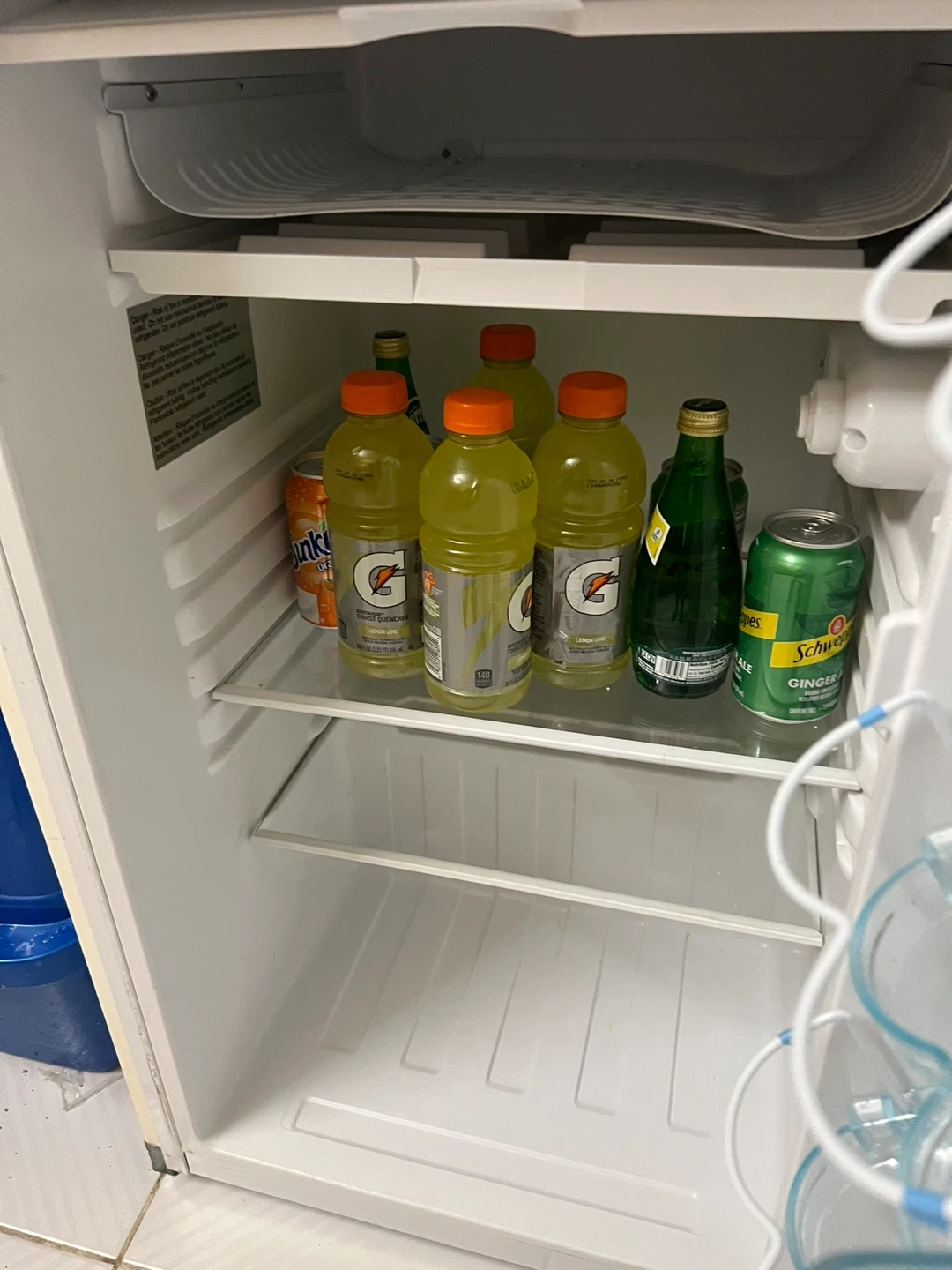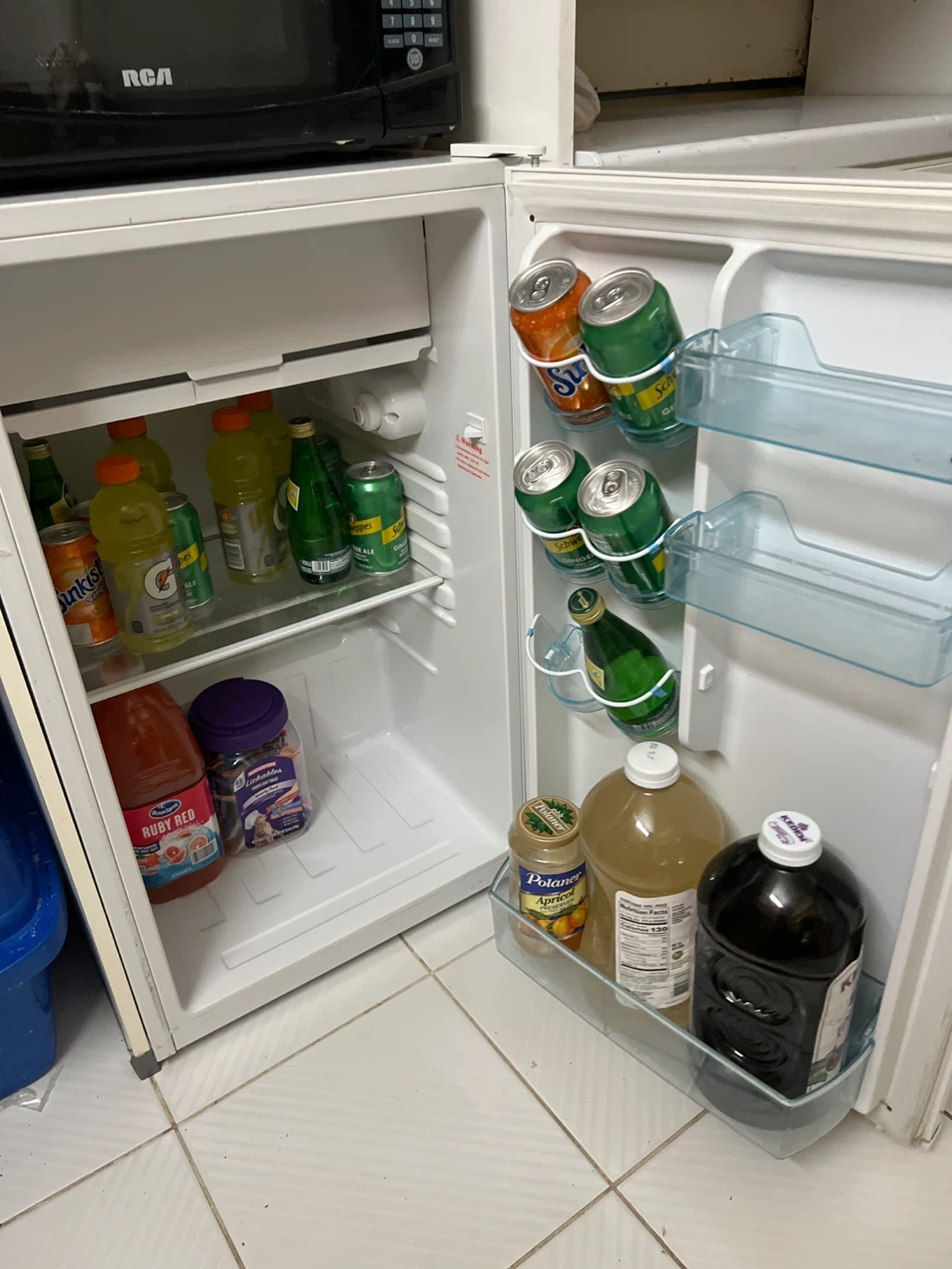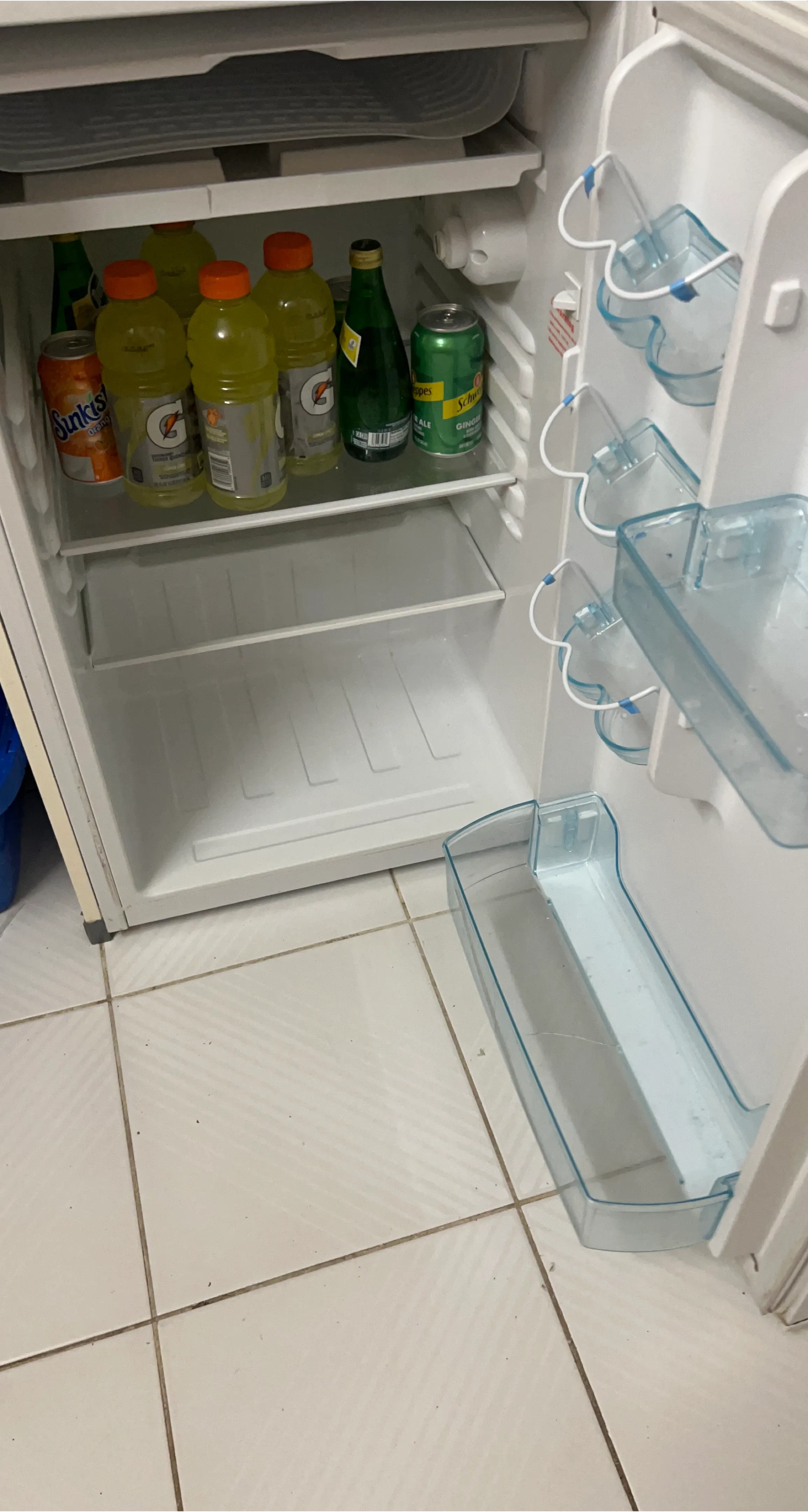 This is a white Avanti compact refrigerator. It's Energy Star certified. It includes door shelves and interior shelving. The top includes a freezer that works perfectly.