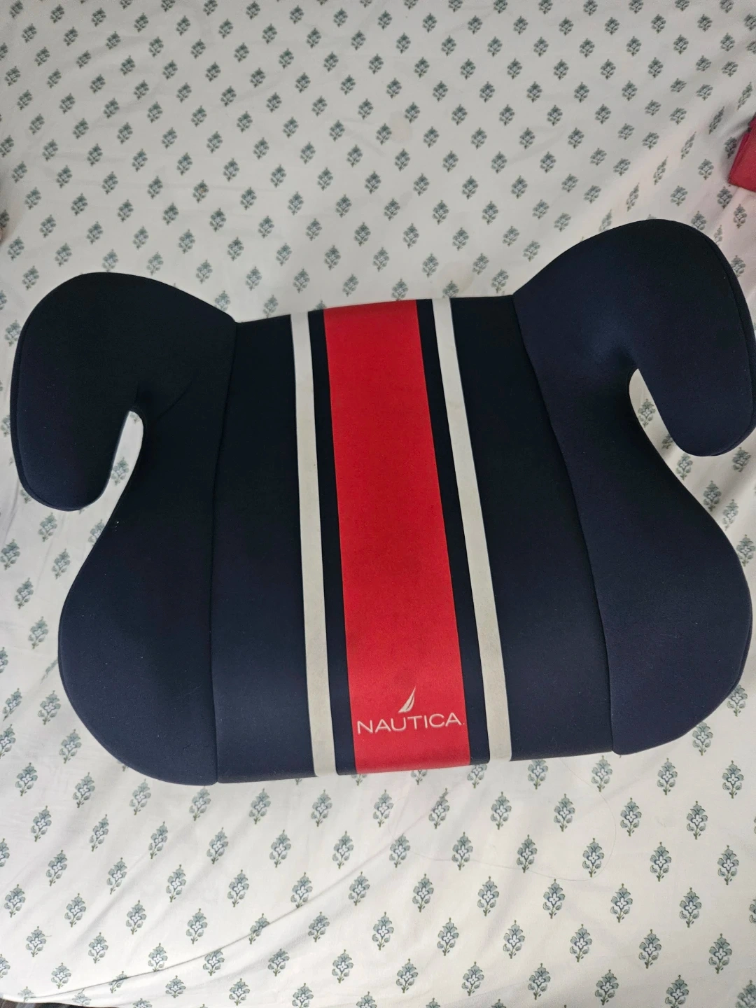 This is a Nautica booster car seat. It's a comfortable and safe option for your child's travel. The seat is made of durable fabric.