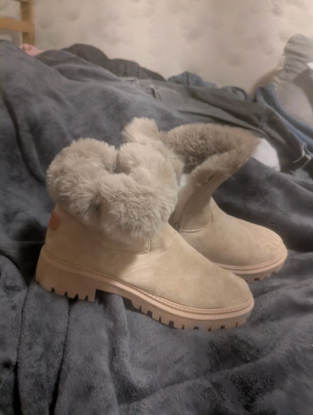 Cozy up your feet in these tan winter boots! They feature a faux suede exterior with a super soft faux fur lining and trim for extra warmth. The side zipper makes them easy to get on and off. They have a durable lug sole for good traction. Size 250 (approx. women's 8.5 Canadian).