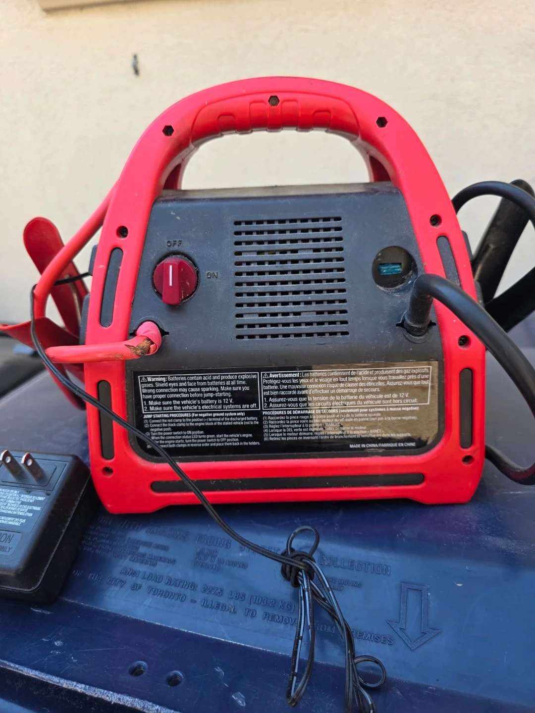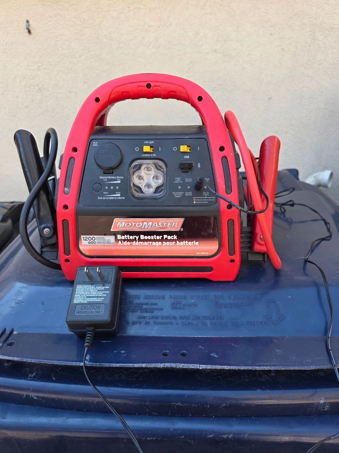 This MotoMaster battery booster pack is red and black. It has a 1200 peak amp rating and includes a charging adapter. Useful for jump-starting a dead car battery when you're on the go!