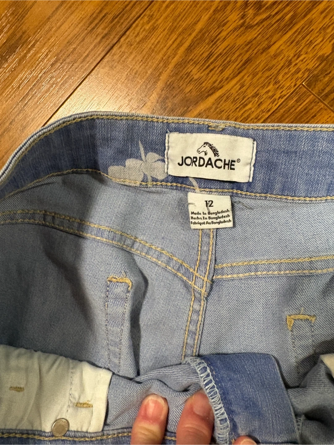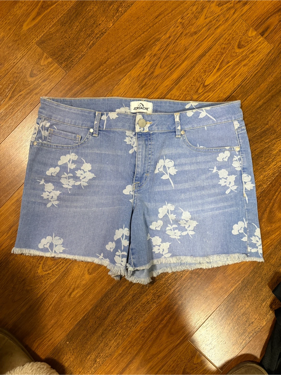 Jordache women's X 2–shorts size 12. They feature a light wash denim with a white floral print and frayed hem.. two pairs of five dollars each in excellent condition.