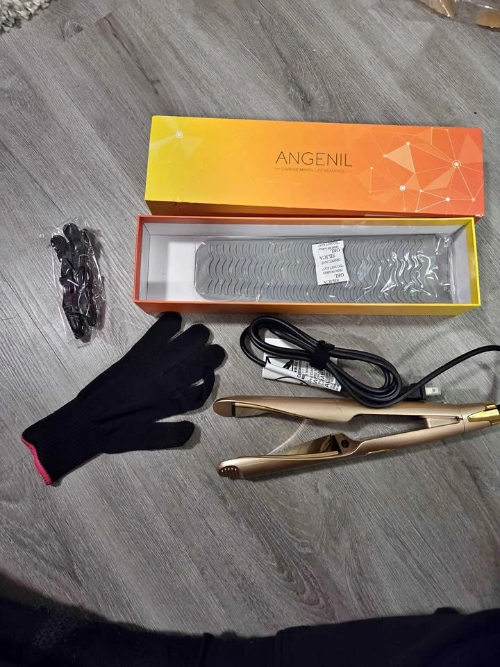 New ANGENIL professional flat iron, great for straightening or curling. Features titanium plates for long-lasting styles. Includes heat-resistant glove, hair clips, and mat. Multiple temperature settings, automatic shutoff for safety. Heats up in 60 seconds with a swivel cord for easy styling.