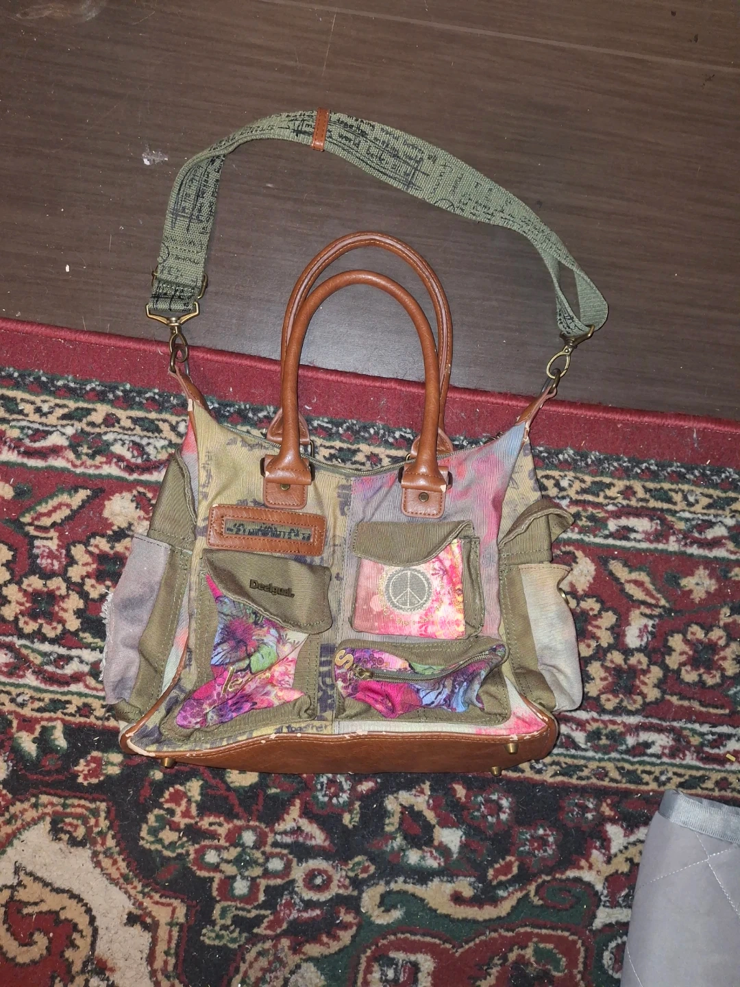 This Desigual satchel bag features a colourful patchwork design with leather trim. It has multiple exterior pockets and a detachable shoulder strap. A unique statement piece!