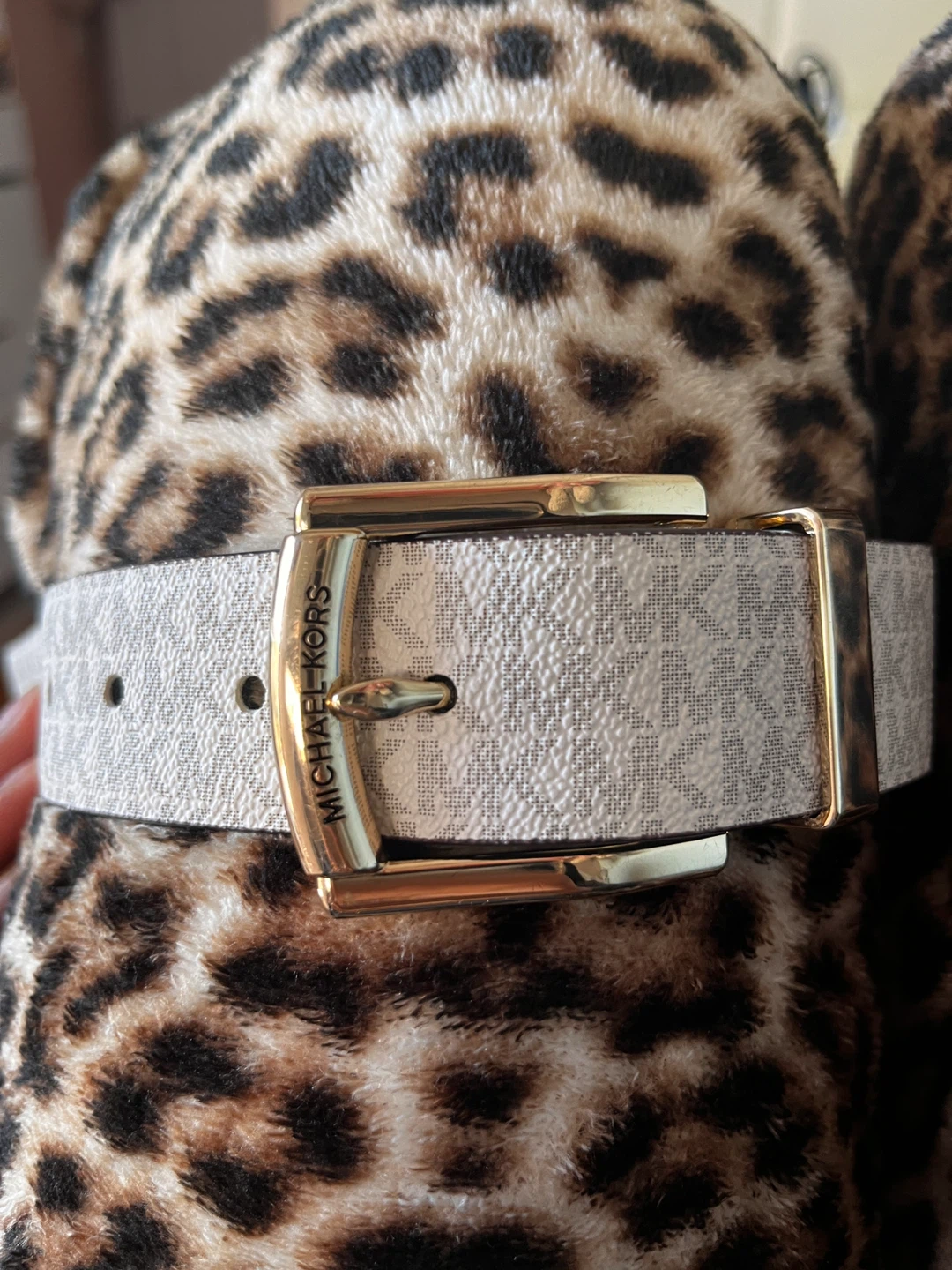 Here is a Michael Kors belt. It’s white in one side and brown in the other!It features the MK logo pattern and a gold-tone buckle. It's in great condition!